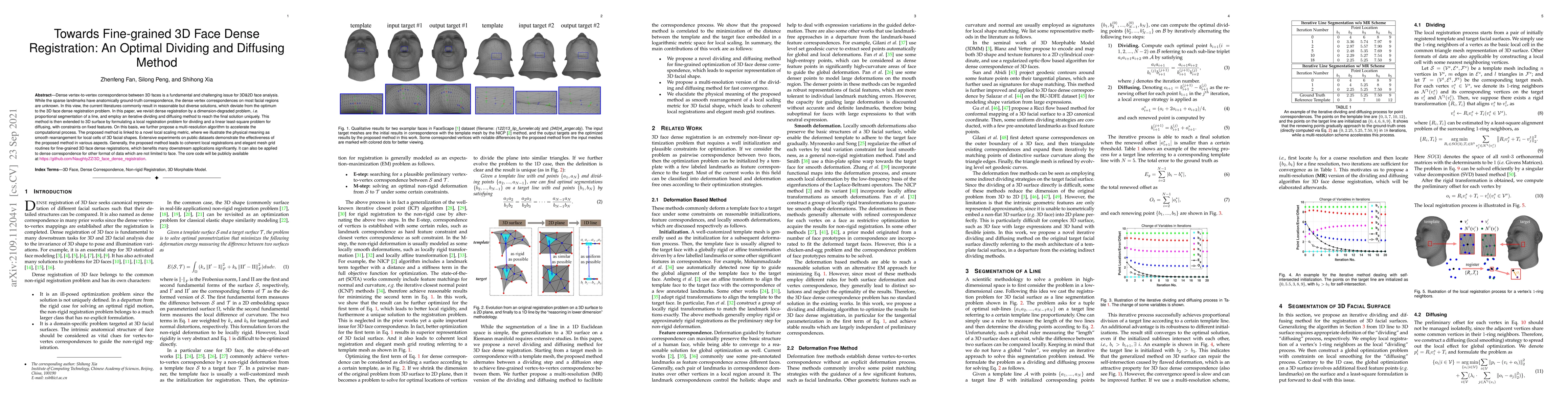 This paper proposes a novel iterative dividing and diffusing method for fine-grained 3D face dense registration, transforming the problem into a dimension-degraded segmentation task. The method achieves coherent local registrations and accelerates computation via a multi-resolution algorithm, demonstrating effectiveness on public datasets and applicability to other data formats.