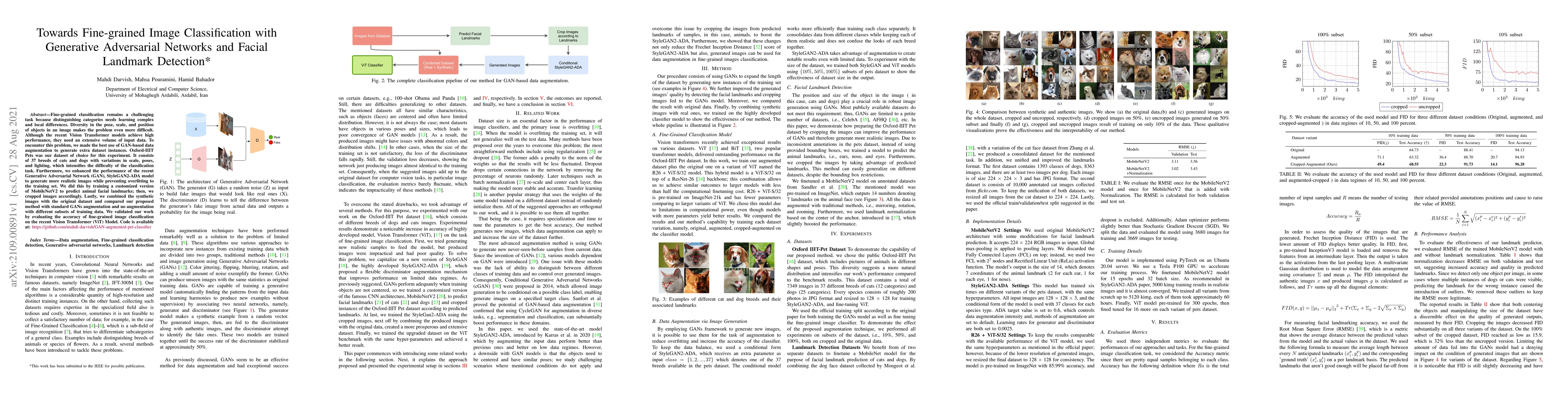 This paper proposes a method for fine-grained image classification using Generative Adversarial Networks (GANs) and facial landmark detection to augment data and improve performance. The study employs StyleGAN2-ADA to generate realistic images and a customized MobileNetV2 for landmark detection, enhancing the Oxford-IIIT Pets dataset before evaluating classification accuracy with a Vision Transformer model.