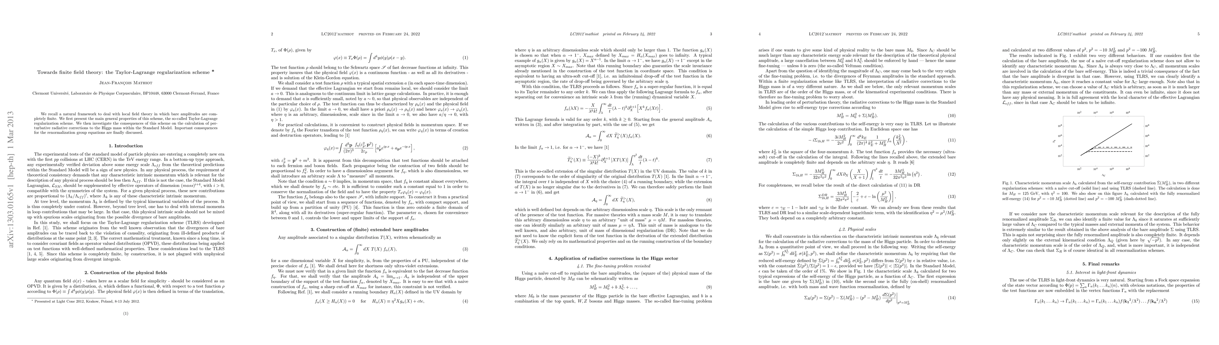 This paper introduces the Taylor-Lagrange regularization scheme for finite field theory, ensuring bare amplitudes are finite, and examines its impact on perturbative radiative corrections to the Higgs mass in the Standard Model, with significant implications for renormalization group equations.