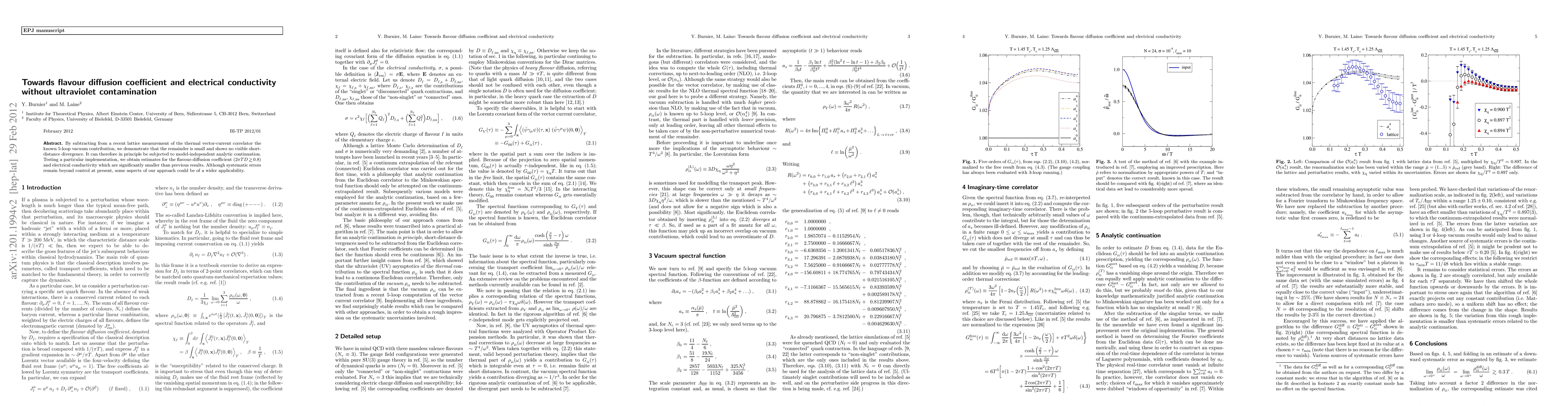 By subtracting from a recent lattice measurement of the thermal vector-current correlator the known 5-loop vacuum contribution, we demonstrate that the remainder is small and shows no visible short-distance divergence. It can therefore in principle be subjected to model-independent analytic continuation. Testing a particular implementation, we obtain estimates for the flavour-diffusion coefficient (2 pi T D \gsim 0.8) and electrical conductivity which are significantly smaller than previous results. Although systematic errors remain beyond control at present, some aspects of our approach could be of a wider applicability.