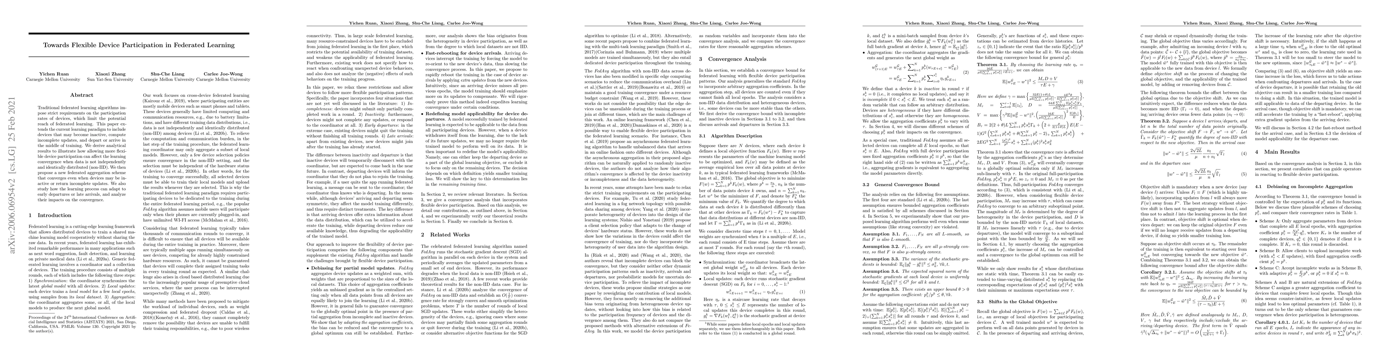 Traditional federated learning algorithms impose strict requirements on the participation rates of devices, which limit the potential reach of federated learning. This paper extends the current learning paradigm to include devices that may become inactive, compute incomplete updates, and depart or arrive in the middle of training. We derive analytical results to illustrate how allowing more flexible device participation can affect the learning convergence when data is not independently and identically distributed (non-IID). We then propose a new federated aggregation scheme that converges even when devices may be inactive or return incomplete updates. We also study how the learning process can adapt to early departures or late arrivals, and analyze their impacts on the convergence.