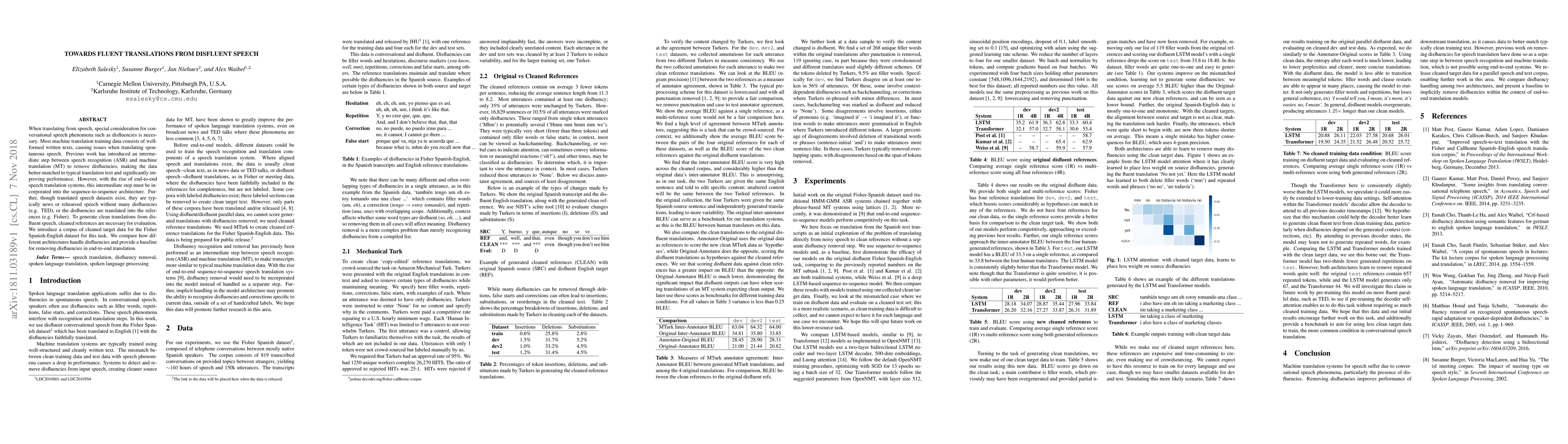 When translating from speech, special consideration for conversational speech phenomena such as disfluencies is necessary. Most machine translation training data consists of well-formed written texts, causing issues when translating spontaneous speech. Previous work has introduced an intermediate step between speech recognition (ASR) and machine translation (MT) to remove disfluencies, making the data better-matched to typical translation text and significantly improving performance. However, with the rise of end-to-end speech translation systems, this intermediate step must be incorporated into the sequence-to-sequence architecture. Further, though translated speech datasets exist, they are typically news or rehearsed speech without many disfluencies (e.g. TED), or the disfluencies are translated into the references (e.g. Fisher). To generate clean translations from disfluent speech, cleaned references are necessary for evaluation. We introduce a corpus of cleaned target data for the Fisher Spanish-English dataset for this task. We compare how different architectures handle disfluencies and provide a baseline for removing disfluencies in end-to-end translation.