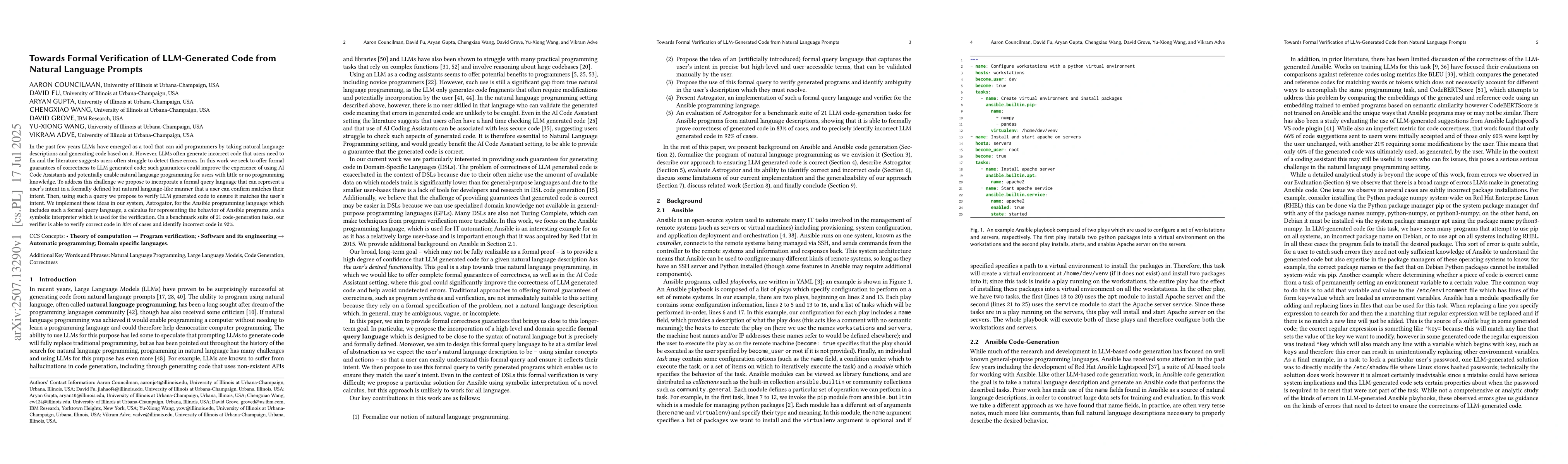 In the past few years LLMs have emerged as a tool that can aid programmers by taking natural language descriptions and generating code based on it. However, LLMs often generate incorrect code that users need to fix and the literature suggests users often struggle to detect these errors. In this work we seek to offer formal guarantees of correctness to LLM generated code; such guarantees could improve the experience of using AI Code Assistants and potentially enable natural language programming for users with little or no programming knowledge. To address this challenge we propose to incorporate a formal query language that can represent a user's intent in a formally defined but natural language-like manner that a user can confirm matches their intent. Then, using such a query we propose to verify LLM generated code to ensure it matches the user's intent. We implement these ideas in our system, Astrogator, for the Ansible programming language which includes such a formal query language, a calculus for representing the behavior of Ansible programs, and a symbolic interpreter which is used for the verification. On a benchmark suite of 21 code-generation tasks, our verifier is able to verify correct code in 83% of cases and identify incorrect code in 92%.