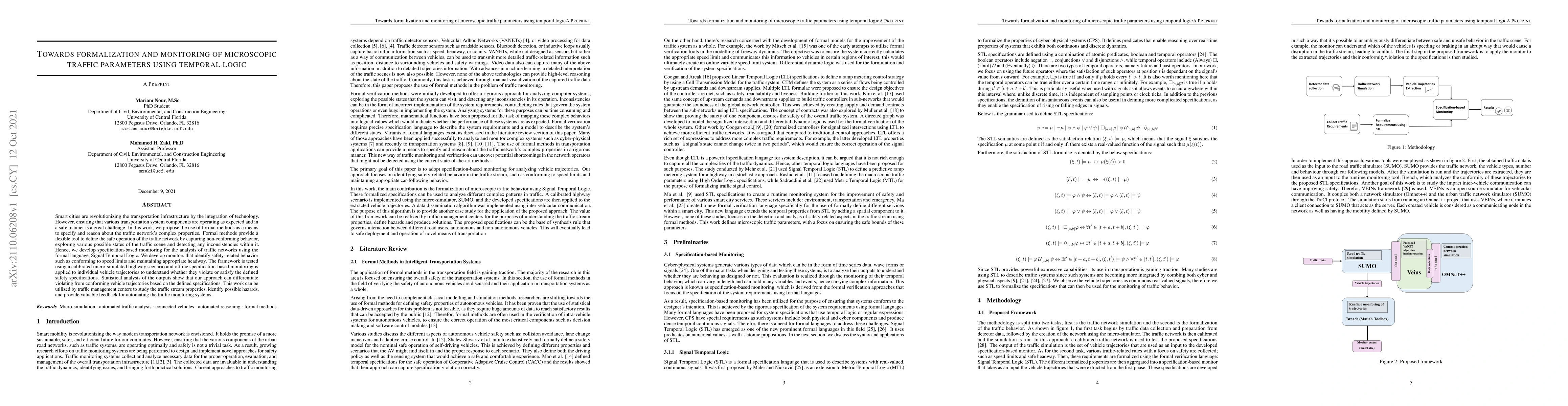 This paper proposes using formal methods and Signal Temporal Logic to specify and monitor microscopic traffic parameters in smart cities, aiming to ensure safe and efficient operation of transportation systems. The developed framework successfully differentiates between conforming and violating vehicle behaviors based on defined safety specifications.