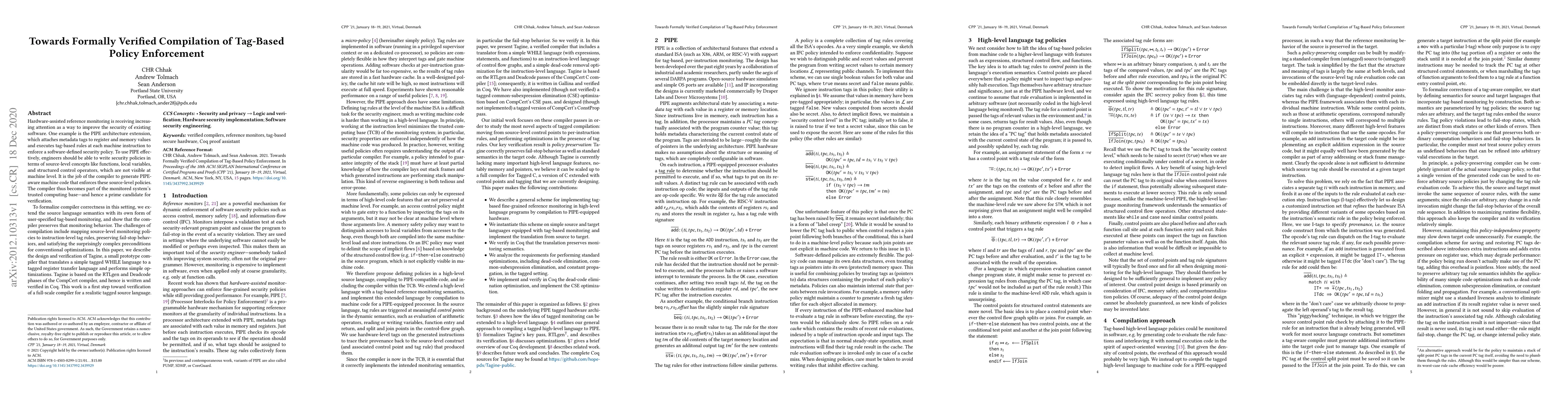 This paper presents Tagine, a prototype compiler for a tag-based policy enforcement system, designed to translate a tagged WHILE language to a tagged register transfer language. The authors extend the source language semantics to include tag-based monitoring and formally verify the compiler's correctness using Coq, ensuring it preserves source-level monitoring policies.