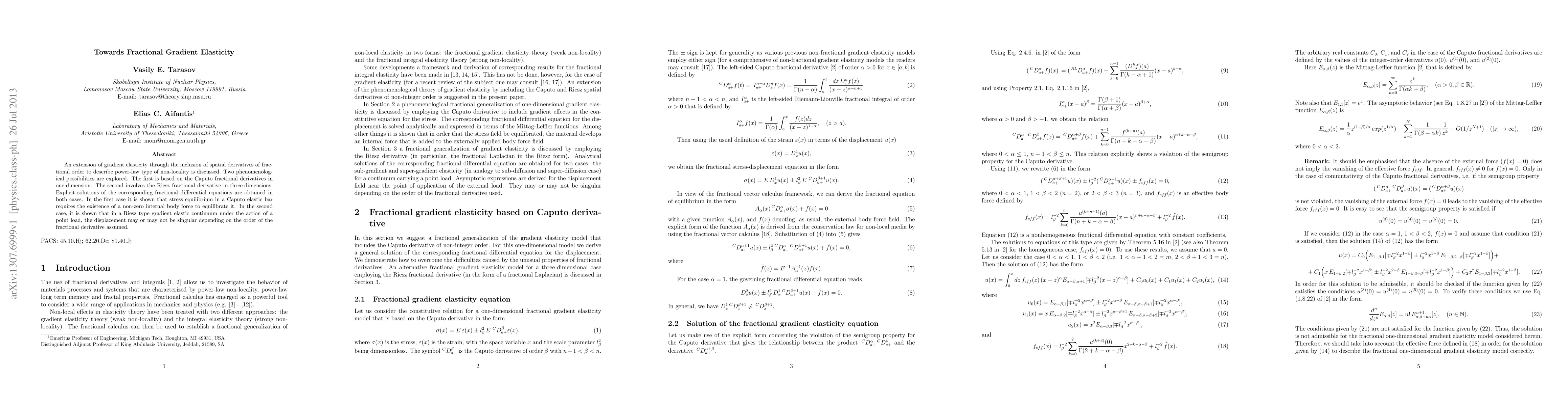 This paper explores the extension of gradient elasticity using fractional spatial derivatives to model non-local effects. It examines two approaches: one using Caputo derivatives in 1D and another using Riesz derivatives in 3D, providing explicit solutions and discussing the implications for stress equilibrium and displacement singularities.