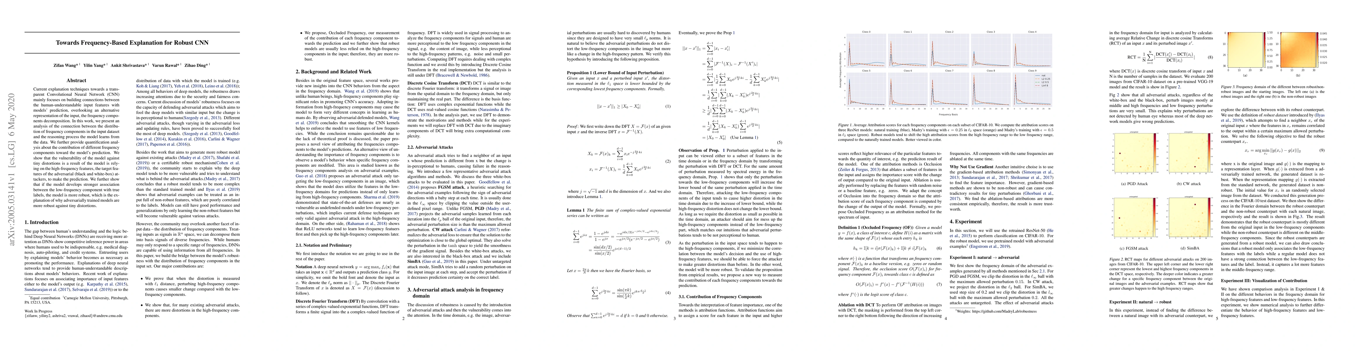 Current explanation techniques towards a transparent Convolutional Neural Network (CNN) mainly focuses on building connections between the human-understandable input features with models' prediction, overlooking an alternative representation of the input, the frequency components decomposition. In this work, we present an analysis of the connection between the distribution of frequency components in the input dataset and the reasoning process the model learns from the data. We further provide quantification analysis about the contribution of different frequency components toward the model's prediction. We show that the vulnerability of the model against tiny distortions is a result of the model is relying on the high-frequency features, the target features of the adversarial (black and white-box) attackers, to make the prediction. We further show that if the model develops stronger association between the low-frequency component with true labels, the model is more robust, which is the explanation of why adversarially trained models are more robust against tiny distortions.