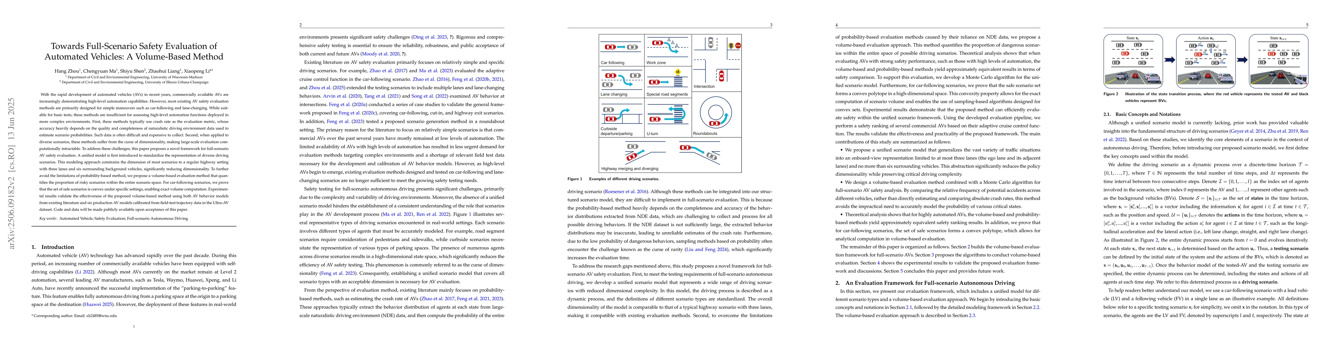 With the rapid development of automated vehicles (AVs) in recent years, commercially available AVs are increasingly demonstrating high-level automation capabilities. However, most existing AV safety evaluation methods are primarily designed for simple maneuvers such as car-following and lane-changing. While suitable for basic tests, these methods are insufficient for assessing high-level automation functions deployed in more complex environments. First, these methods typically use crash rate as the evaluation metric, whose accuracy heavily depends on the quality and completeness of naturalistic driving environment data used to estimate scenario probabilities. Such data is often difficult and expensive to collect. Second, when applied to diverse scenarios, these methods suffer from the curse of dimensionality, making large-scale evaluation computationally intractable. To address these challenges, this paper proposes a novel framework for full-scenario AV safety evaluation. A unified model is first introduced to standardize the representation of diverse driving scenarios. This modeling approach constrains the dimension of most scenarios to a regular highway setting with three lanes and six surrounding background vehicles, significantly reducing dimensionality. To further avoid the limitations of probability-based method, we propose a volume-based evaluation method that quantifies the proportion of risky scenarios within the entire scenario space. For car-following scenarios, we prove that the set of safe scenarios is convex under specific settings, enabling exact volume computation. Experimental results validate the effectiveness of the proposed volume-based method using both AV behavior models from existing literature and six production AV models calibrated from field-test trajectory data in the Ultra-AV dataset. Code and data will be made publicly available upon acceptance of this paper.