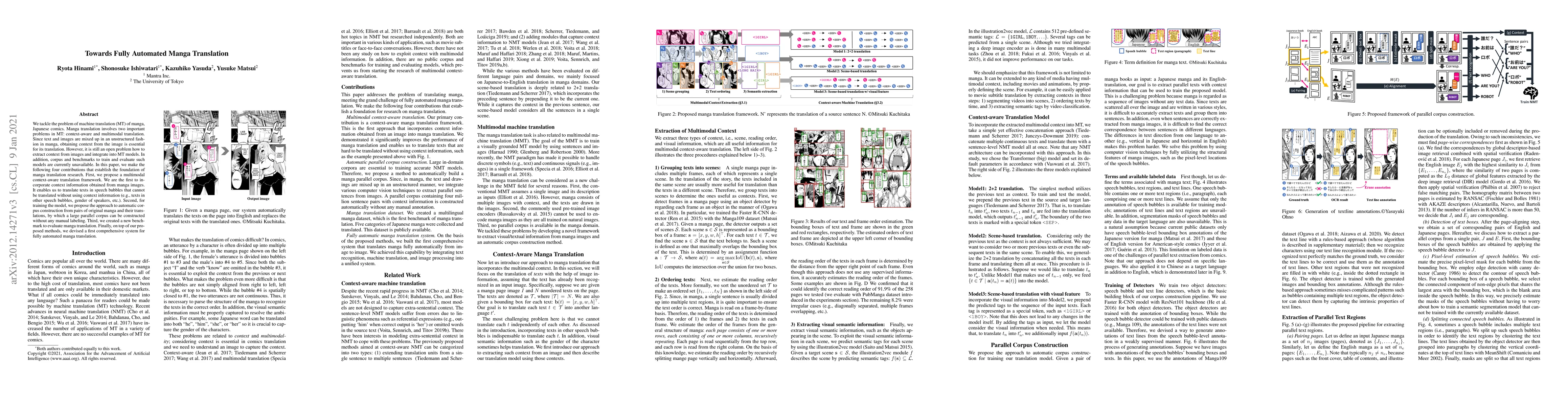 This paper proposes a multimodal context-aware translation framework for manga translation, incorporating image context to enhance text translation. It also introduces an automatic corpus construction method and a new benchmark for evaluation, culminating in a comprehensive system for fully automated manga translation.