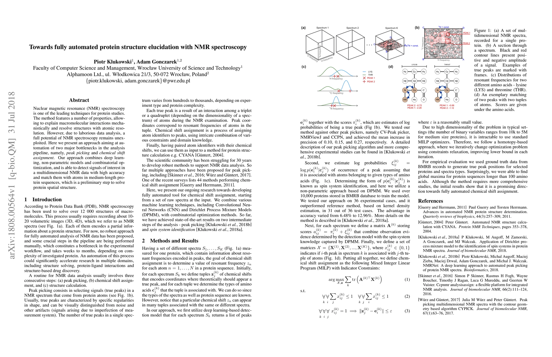 This paper proposes an automated method using deep learning and optimization to tackle two key challenges in NMR spectroscopy data analysis: peak picking and chemical shift assignment. The approach aims to fully automate the process, enabling the full potential of NMR for protein structure elucidation.