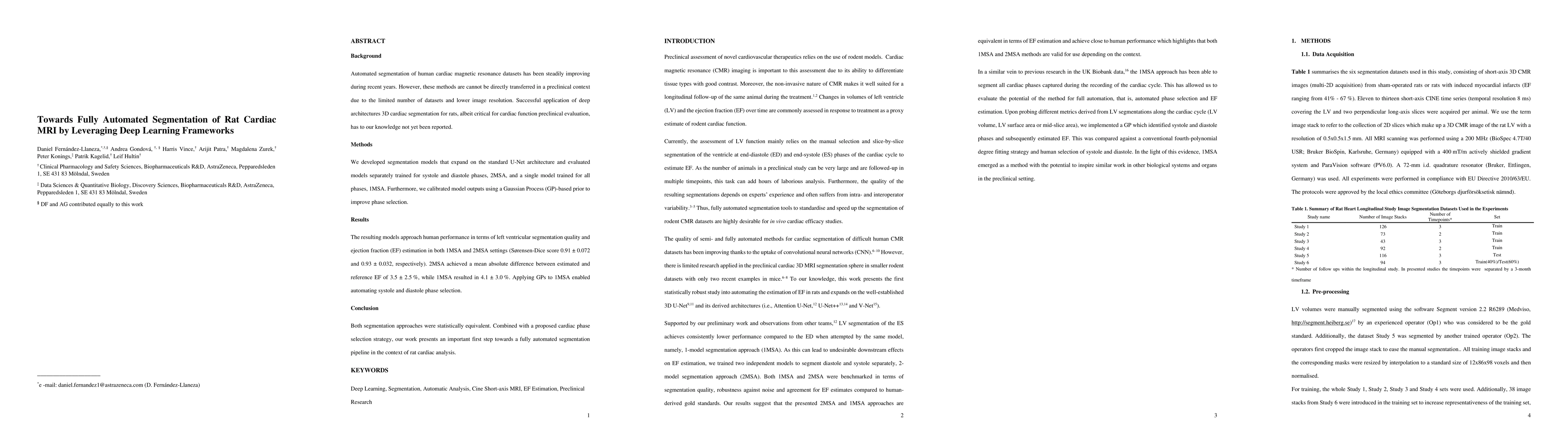 This paper develops deep learning models for automated segmentation of rat cardiac MRI, expanding on the U-Net architecture to handle systole and diastole phases separately and all timepoints together. The use of Gaussian Processes improves phase selection, achieving near-human performance in left ventricular segmentation and ejection fraction estimation.