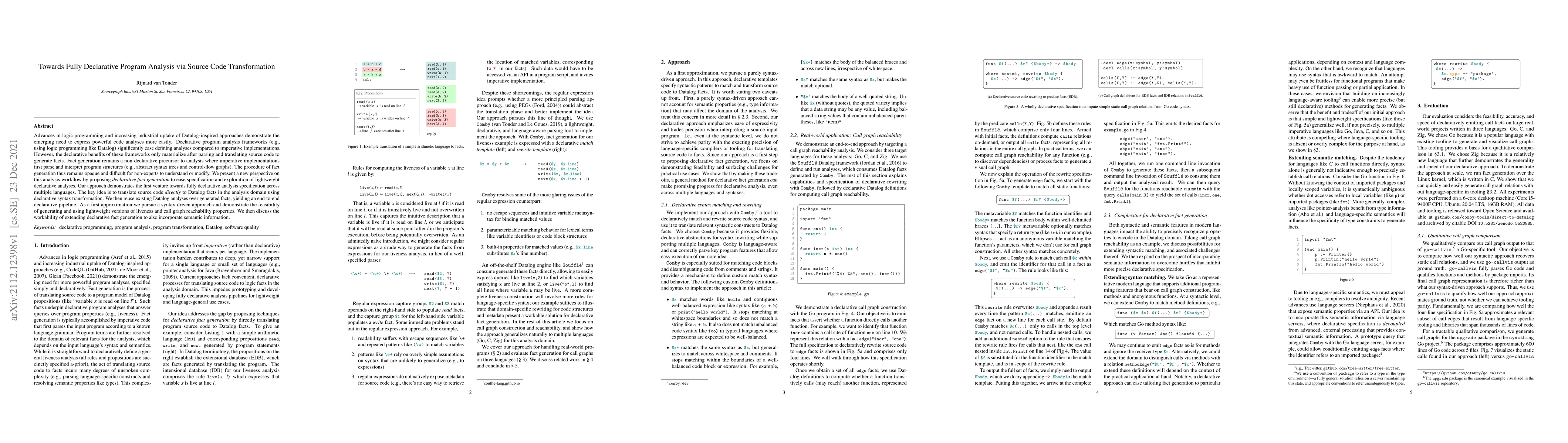 This paper proposes a method for fully declarative program analysis by transforming source code directly into Datalog facts using declarative syntax transformation, aiming to simplify the specification and exploration of analyses. The approach demonstrates initial success in generating lightweight analyses for liveness and call graph reachability properties.