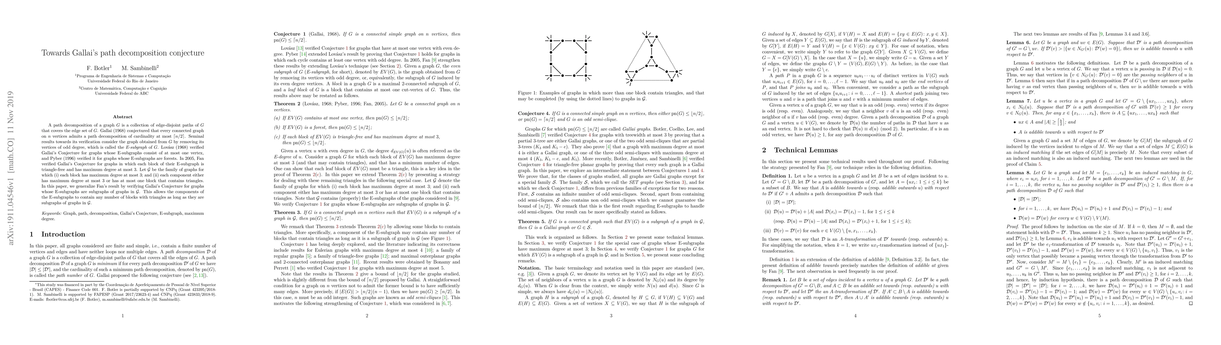 A path decomposition of a graph G is a collection of edge-disjoint paths of G that covers the edge set of G. Gallai (1968) conjectured that every connected graph on n vertices admits a path decomposition of cardinality at most (n+1)/2. Seminal results towards its verification consider the graph obtained from G by removing its vertices of odd degree, which is called the E-subgraph of G. Lov\'asz (1968) verified Gallai's Conjecture for graphs whose E-subgraphs consist of at most one vertex, and Pyber (1996) verified it for graphs whose E-subgraphs are forests. In 2005, Fan verified Gallai's Conjecture for graphs in which each block of their E-subgraph is triangle-free and has maximum degree at most 3. Let calG be the family of graphs for which (i) each block has maximum degree at most 3; and (ii) each component either has maximum degree at most 3 or has at most one block that contains triangles. In this paper, we generalize Fan's result by verifying Gallai's Conjecture for graphs whose E-subgraphs are subgraphs of graphs in calG. This allows the components of the E-subgraphs to contain any number of blocks with triangles as long as they are subgraphs of graphs in calG.
