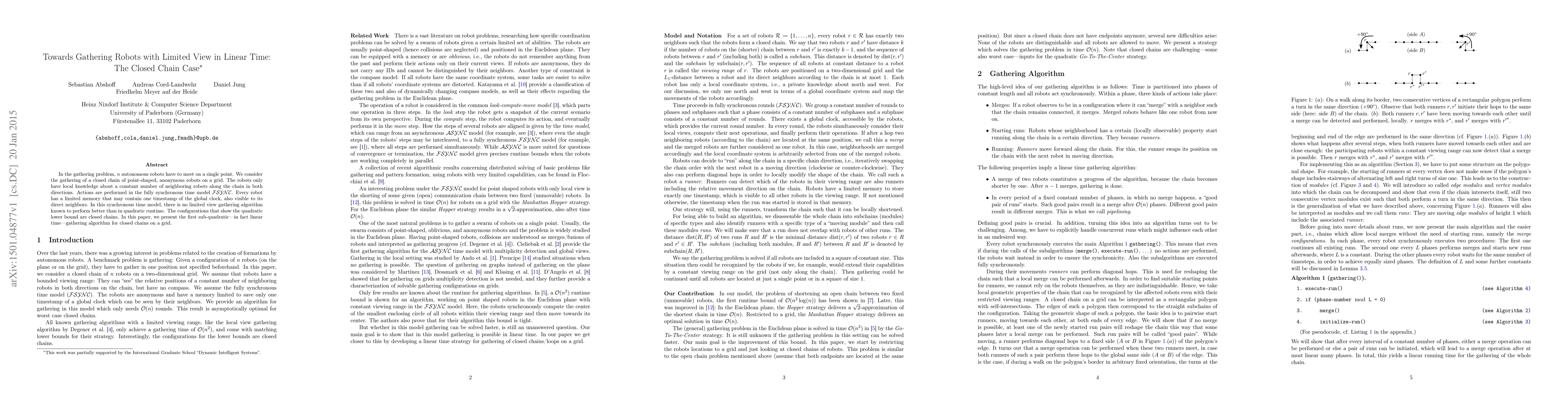 The paper presents a novel initialization-run and merge sub-phase algorithm that enables linear time gathering for closed chains of robots with limited view.