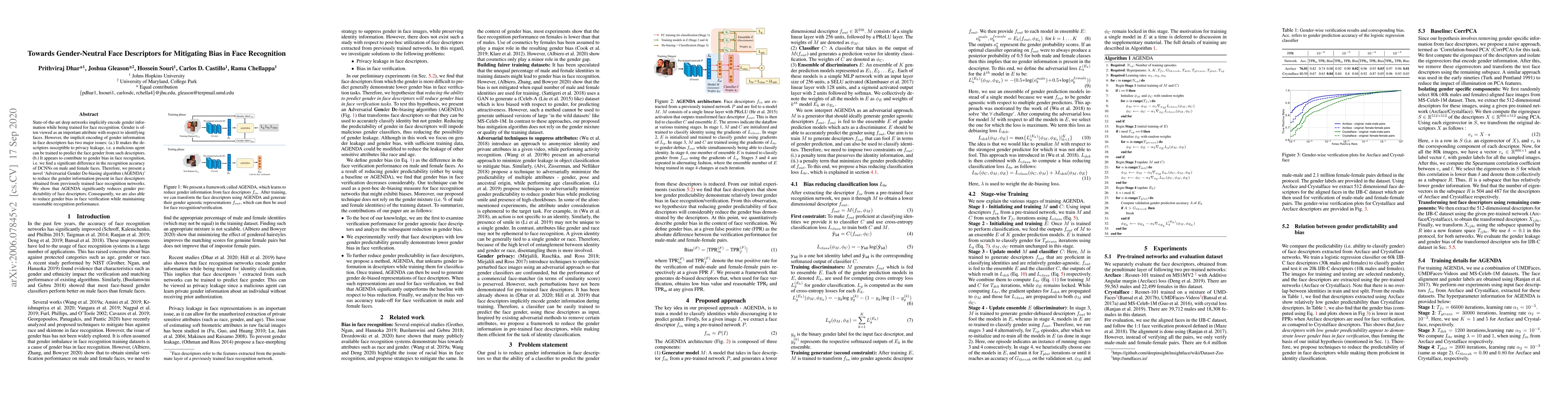 State-of-the-art deep networks implicitly encode gender information while being trained for face recognition. Gender is often viewed as an important attribute with respect to identifying faces. However, the implicit encoding of gender information in face descriptors has two major issues: (a.) It makes the descriptors susceptible to privacy leakage, i.e. a malicious agent can be trained to predict the face gender from such descriptors. (b.) It appears to contribute to gender bias in face recognition, i.e. we find a significant difference in the recognition accuracy of DCNNs on male and female faces. Therefore, we present a novel `Adversarial Gender De-biasing algorithm (AGENDA)' to reduce the gender information present in face descriptors obtained from previously trained face recognition networks. We show that AGENDA significantly reduces gender predictability of face descriptors. Consequently, we are also able to reduce gender bias in face verification while maintaining reasonable recognition performance.