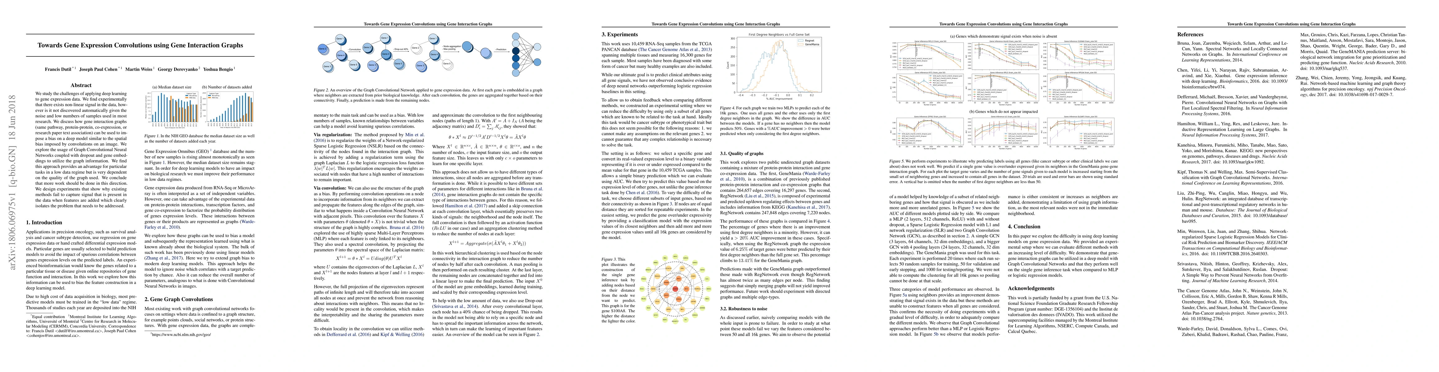 We study the challenges of applying deep learning to gene expression data. We find experimentally that there exists non-linear signal in the data, however is it not discovered automatically given the noise and low numbers of samples used in most research. We discuss how gene interaction graphs (same pathway, protein-protein, co-expression, or research paper text association) can be used to impose a bias on a deep model similar to the spatial bias imposed by convolutions on an image. We explore the usage of Graph Convolutional Neural Networks coupled with dropout and gene embeddings to utilize the graph information. We find this approach provides an advantage for particular tasks in a low data regime but is very dependent on the quality of the graph used. We conclude that more work should be done in this direction. We design experiments that show why existing methods fail to capture signal that is present in the data when features are added which clearly isolates the problem that needs to be addressed.