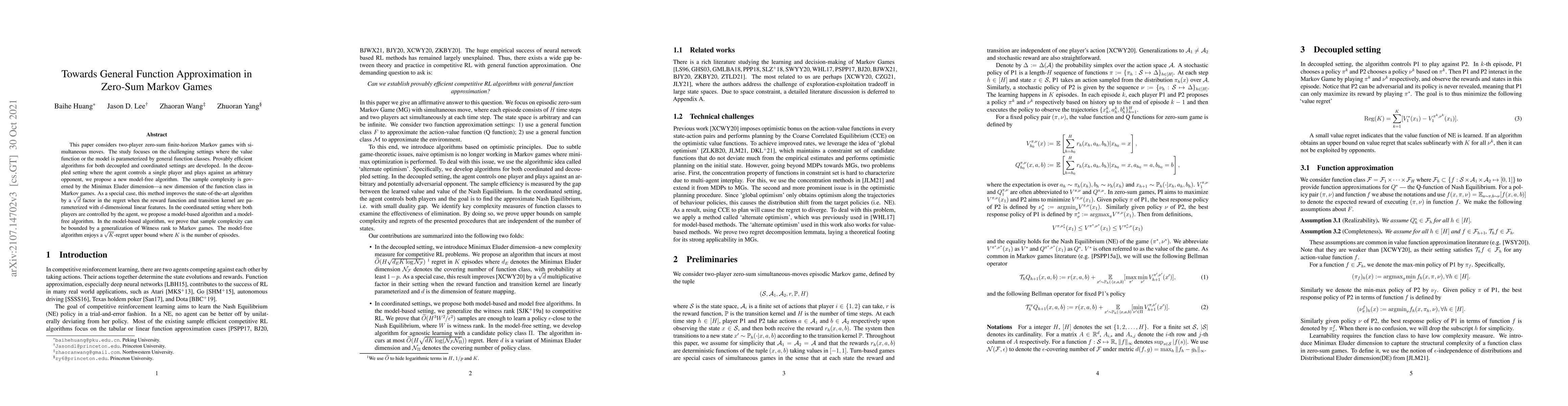 The paper develops provably efficient algorithms for both decoupled and coordinated settings in two-player zero-sum finite-horizon Markov games, focusing on value functions parameterized by general function classes.