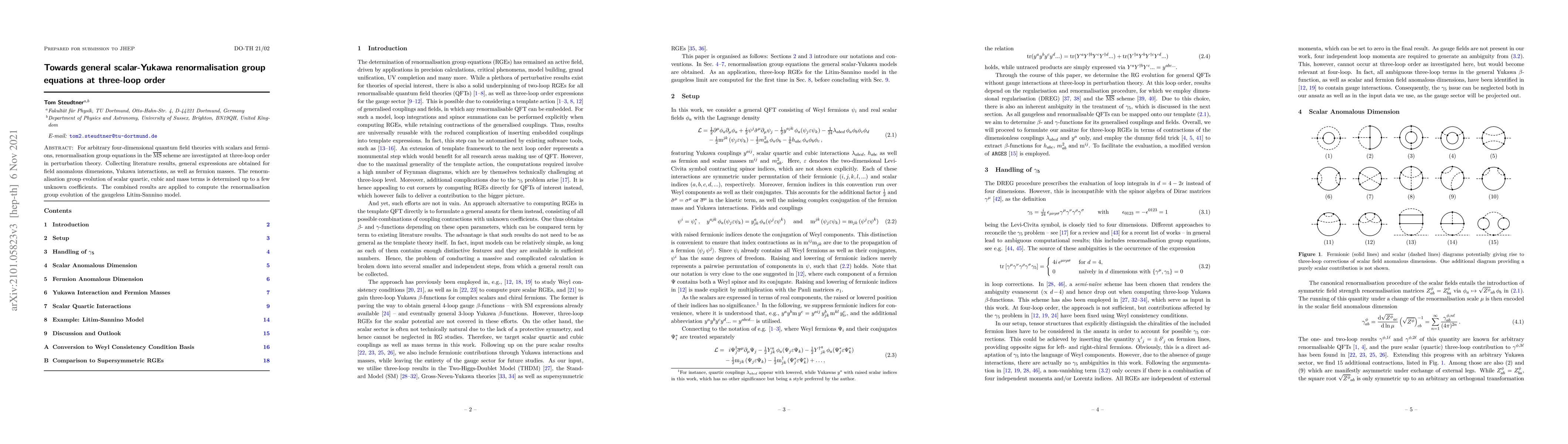 For arbitrary four-dimensional quantum field theories with scalars and fermions, renormalisation group equations in the $\overline{\text{MS}}$ scheme are investigated at three-loop order in perturbation theory. Collecting literature results, general expressions are obtained for field anomalous dimensions, Yukawa interactions, as well as fermion masses. The renormalisation group evolution of scalar quartic, cubic and mass terms is determined up to a few unknown coefficients. The combined results are applied to compute the renormalisation group evolution of the gaugeless Litim-Sannino model.