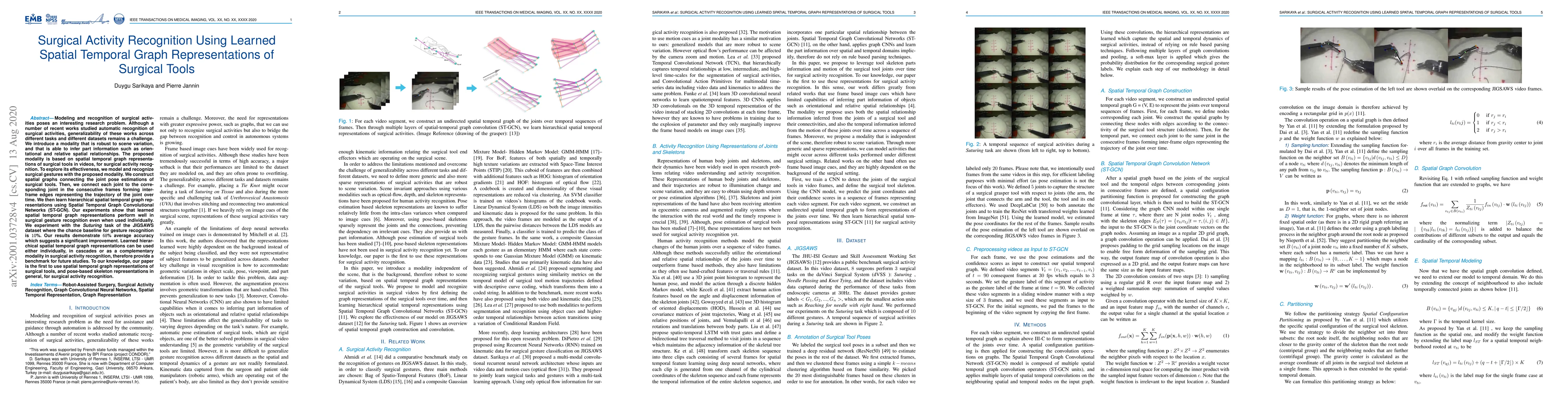 This paper proposes a novel spatial temporal graph convolutional network for surgical activity recognition, using spatial graphs of surgical tools' joint poses and inter-frame edges to model tool trajectories. The method achieves 68% accuracy on the JIGSAWS Suturing task, demonstrating significant improvement over baselines and offering a new benchmark for future studies.