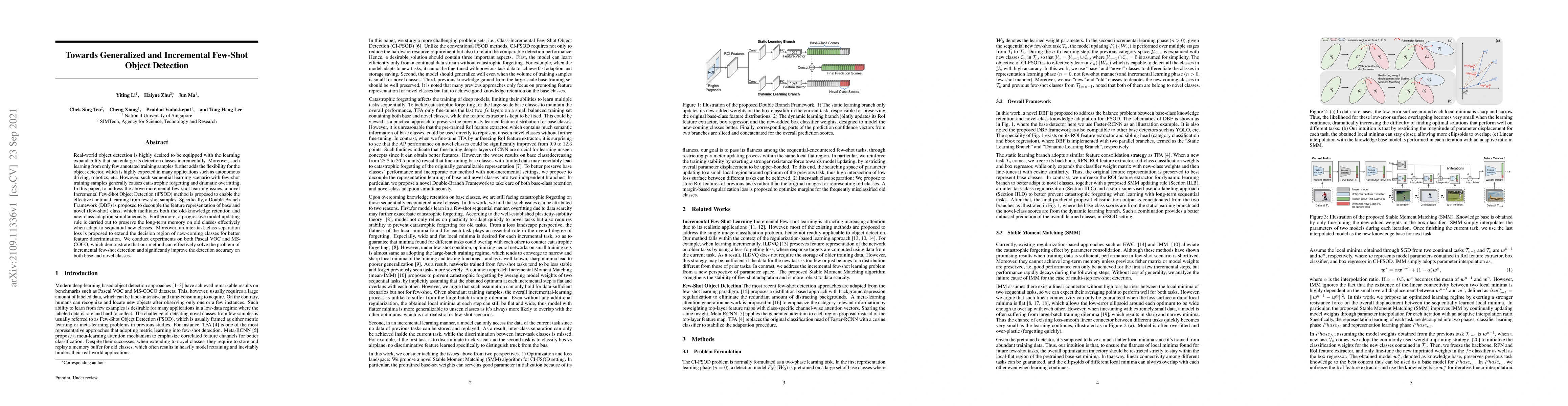 This paper proposes an Incremental Few-Shot Object Detection (iFSOD) method to address the challenges of continual learning with few annotated training samples. The Double-Branch Framework (DBF) decouples feature representations for base and new classes, while the progressive model updating rule and inter-task class separation loss enhance both old-knowledge retention and new-class adaptation, achieving improved detection accuracy on both base and novel classes in experiments on Pascal VOC and MS-COCO.