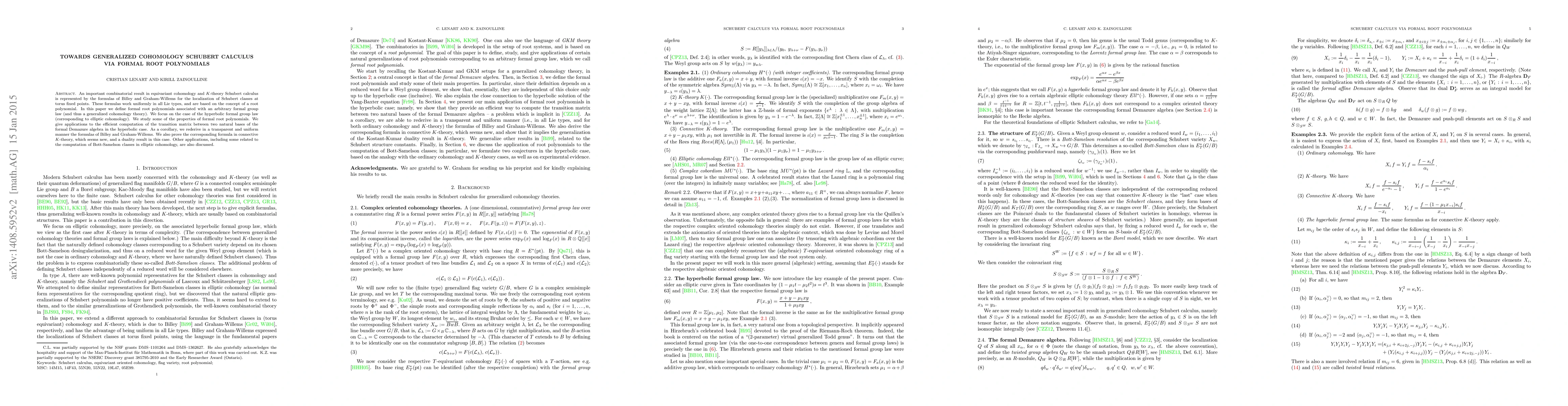 An important combinatorial result in equivariant cohomology and $K$-theory Schubert calculus is represented by the formulas of Billey and Graham-Willems for the localization of Schubert classes at torus fixed points. These formulas work uniformly in all Lie types, and are based on the concept of a root polynomial. In this paper we define formal root polynomials associated with an arbitrary formal group law (and thus a generalized cohomology theory). We focus on the case of the hyperbolic formal group law (corresponding to elliptic cohomology). We study some of the properties of formal root polynomials. We give applications to the efficient computation of the transition matrix between two natural bases of the formal Demazure algebra in the hyperbolic case. As a corollary, we rederive in a transparent and uniform manner the formulas of Billey and Graham-Willems. We also prove the corresponding formula in connective $K$-theory, which seems new, and a duality result in this case. Other applications, including some related to the computation of Bott-Samelson classes in elliptic cohomology, are also discussed.