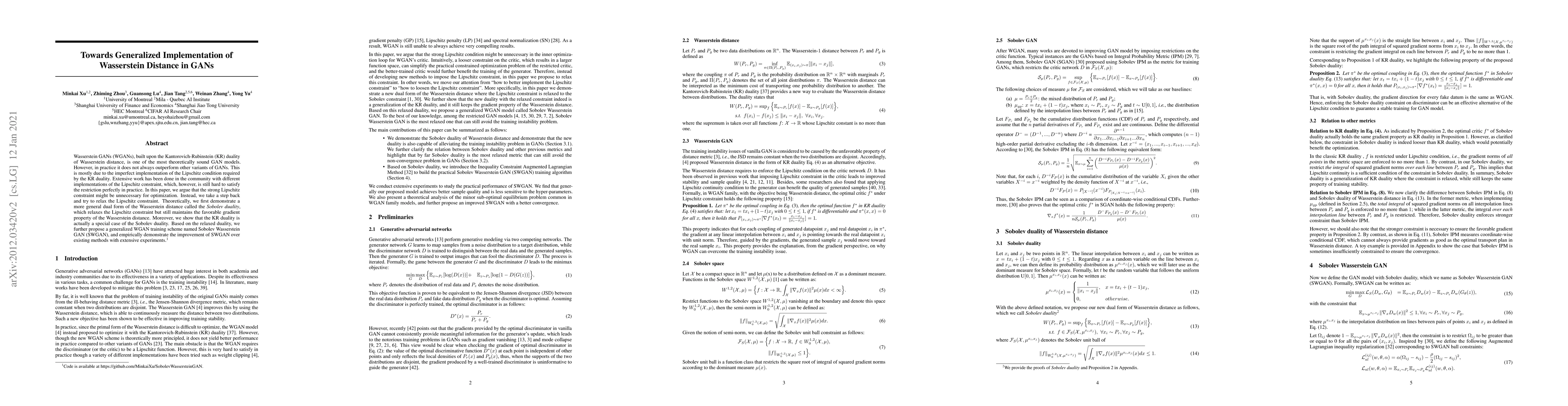 This paper proposes a generalized form of Wasserstein GANs (WGANs) called Sobolev Wasserstein GAN (SWGAN) that relaxes the strict Lipschitz constraint, leading to improved performance and practical implementation. The authors introduce Sobolev duality, which maintains the gradient benefits of Wasserstein distance while being less restrictive.
