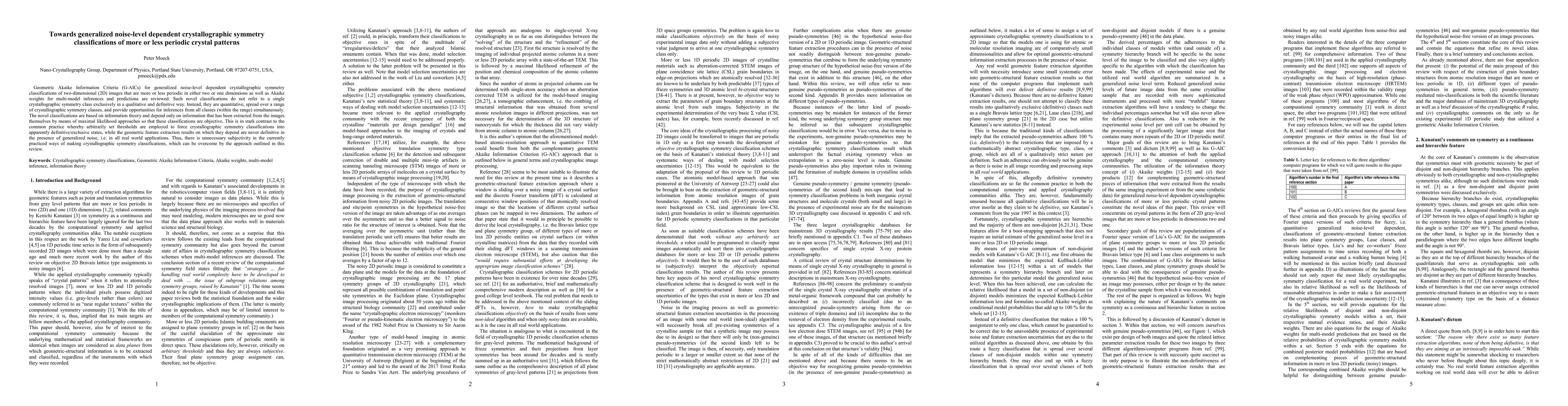 Geometric Akaike Information Criteria (G-AICs) for generalized noise-level dependent crystallographic symmetry classifications of two-dimensional (2D) images that are more or less periodic in either two or one dimensions as well as Akaike weights for multi-model inferences and predictions are reviewed. Such novel classifications do not refer to a single crystallographic symmetry class exclusively in a qualitative and definitive way. Instead, they are quantitative, spread over a range of crystallographic symmetry classes, and provide opportunities for inferences from all classes (within the range) simultaneously. The novel classifications are based on information theory and depend only on information that has been extracted from the images themselves by means of maximal likelihood approaches so that these classifications are objective. This is in stark contrast to the common practice whereby arbitrarily set thresholds are employed to force crystallographic symmetry classifications into apparently definitive/exclusive states, while the geometric feature extraction results on which they depend are never definitive in the presence of generalized noise, i.e. in all real world applications. Thus, there is unnecessary subjectivity in the currently practiced ways of making crystallographic symmetry classifications, which can be overcome by the approach outlined in this review.