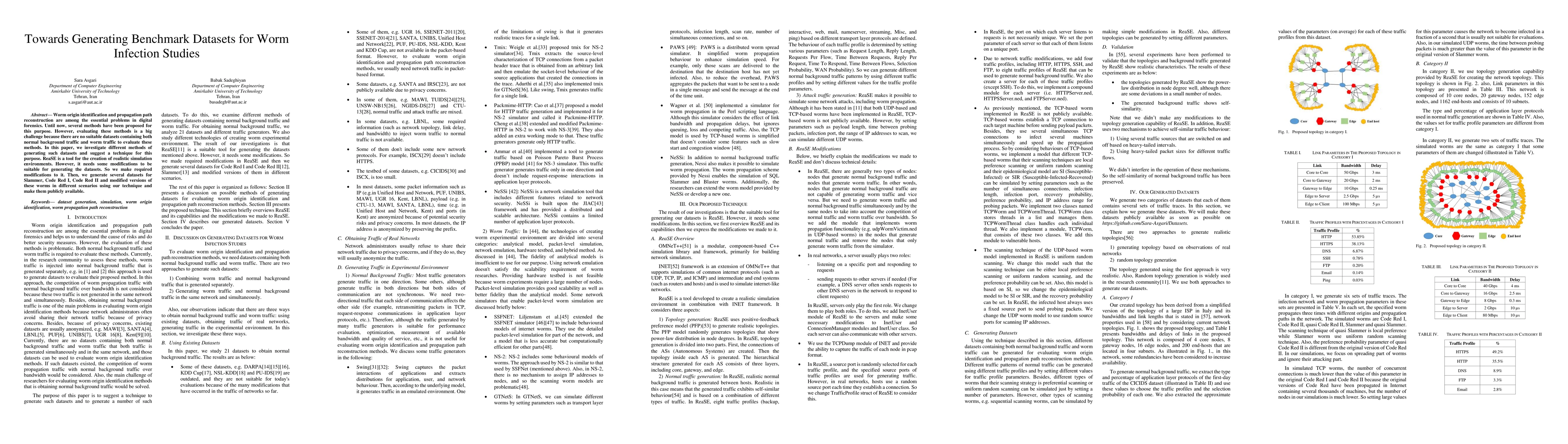 Worm origin identification and propagation path reconstruction are among the essential problems in digital forensics. Until now, several methods have been proposed for this purpose. However, evaluating these methods is a big challenge because there are no suitable datasets containing both normal background traffic and worm traffic to evaluate these methods. In this paper, we investigate different methods of generating such datasets and suggest a technique for this purpose. ReaSE is a tool for the creation of realistic simulation environments. However, it needs some modifications to be suitable for generating the datasets. So we make required modifications to it. Then, we generate several datasets for Slammer, Code Red I, Code Red II and modified versions of these worms in different scenarios using our technique and make them publicly available.