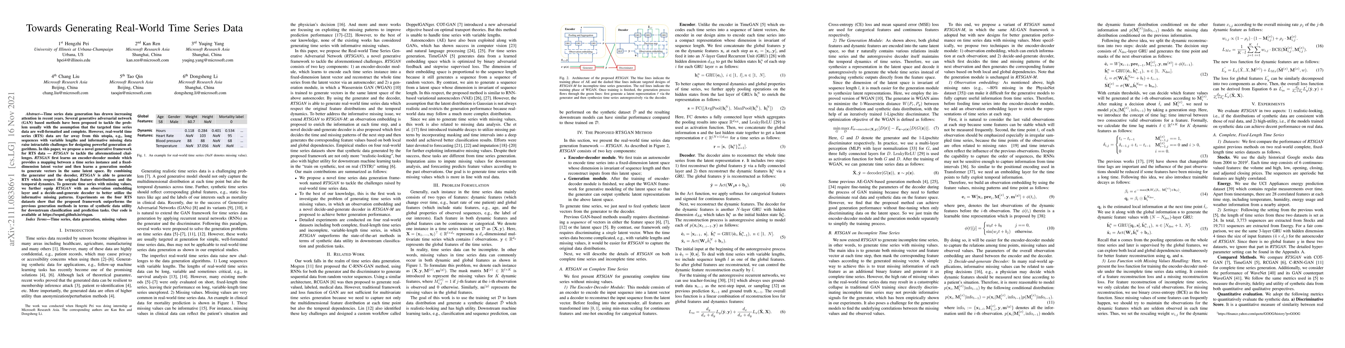Time series data generation has drawn increasing attention in recent years. Several generative adversarial network (GAN) based methods have been proposed to tackle the problem usually with the assumption that the targeted time series data are well-formatted and complete. However, real-world time series (RTS) data are far away from this utopia, e.g., long sequences with variable lengths and informative missing data raise intractable challenges for designing powerful generation algorithms. In this paper, we propose a novel generative framework for RTS data - RTSGAN to tackle the aforementioned challenges. RTSGAN first learns an encoder-decoder module which provides a mapping between a time series instance and a fixed-dimension latent vector and then learns a generation module to generate vectors in the same latent space. By combining the generator and the decoder, RTSGAN is able to generate RTS which respect the original feature distributions and the temporal dynamics. To generate time series with missing values, we further equip RTSGAN with an observation embedding layer and a decide-and-generate decoder to better utilize the informative missing patterns. Experiments on the four RTS datasets show that the proposed framework outperforms the previous generation methods in terms of synthetic data utility for downstream classification and prediction tasks.