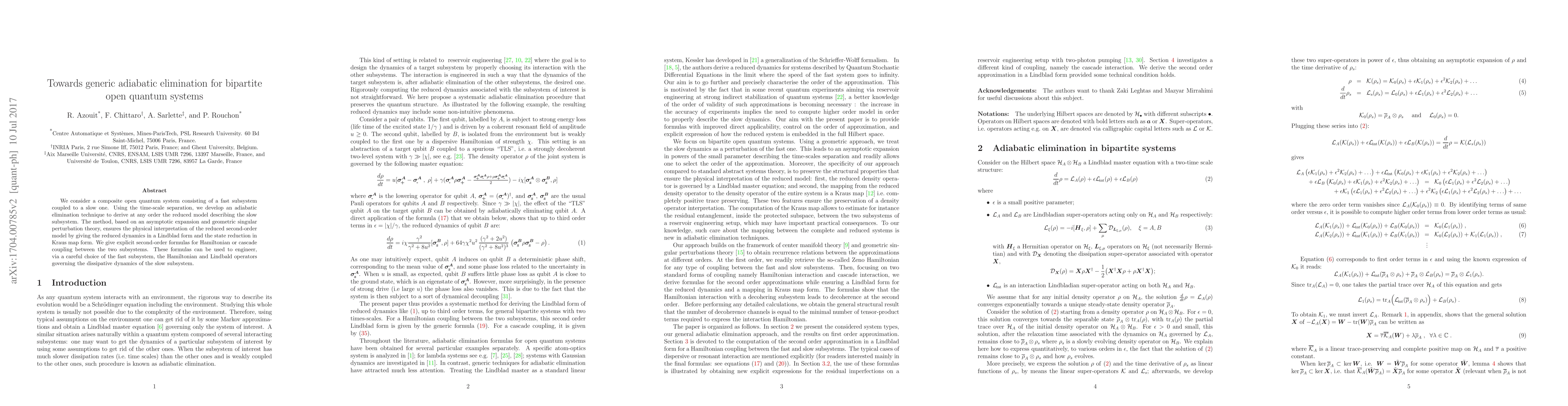 We consider a composite open quantum system consisting of a fast subsystem coupled to a slow one. Using the time-scale separation, we develop an adiabatic elimination technique to derive at any order the reduced model describing the slow subsystem. The method, based on an asymptotic expansion and geometric singular perturbation theory, ensures the physical interpretation of the reduced second-order model by giving the reduced dynamics in a Lindblad form and the state reduction in Kraus map form. We give explicit second-order formulas for Hamiltonian or cascade coupling between the two subsystems. These formulas can be used to engineer, via a careful choice of the fast subsystem, the Hamiltonian and Lindbald operators governing the dissipative dynamics of the slow subsystem.