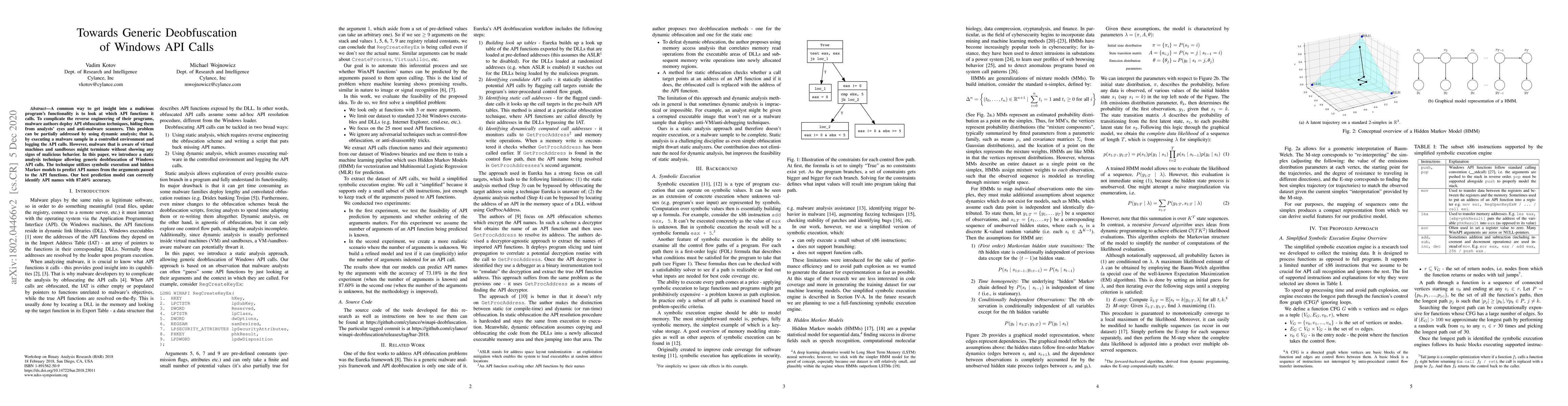 This paper proposes a static analysis method for deobfuscating Windows API calls in obfuscated malware using symbolic execution and hidden Markov models. The technique achieves 87.60% accuracy in identifying API names, offering a solution to bypass obfuscation techniques used by malware authors.