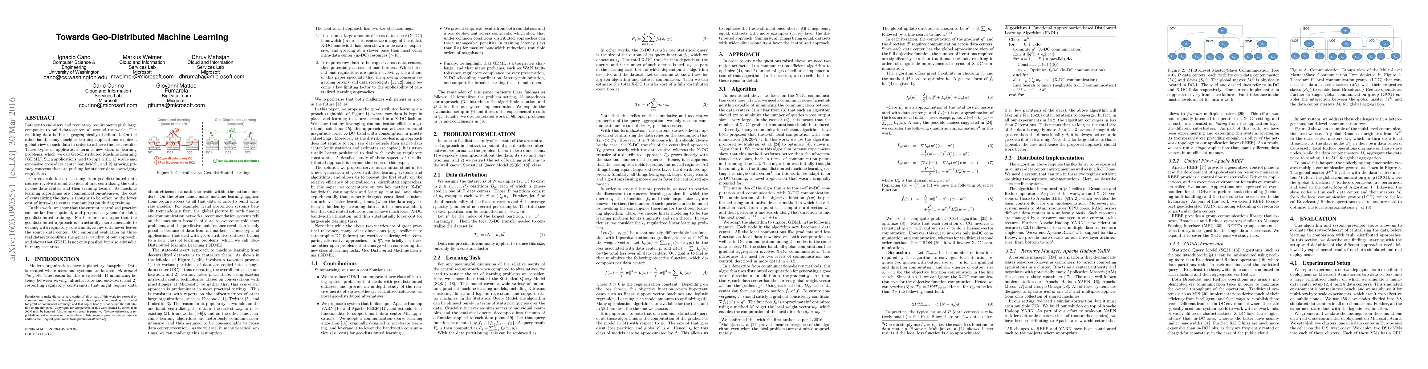 This paper introduces Geo-Distributed Machine Learning (GDML) to address the challenges of latency and regulatory constraints in training machine learning models across geographically distributed data centers. It proposes a geo-distributed training system that avoids centralizing data, thereby reducing bandwidth costs and better complying with data sovereignty regulations.