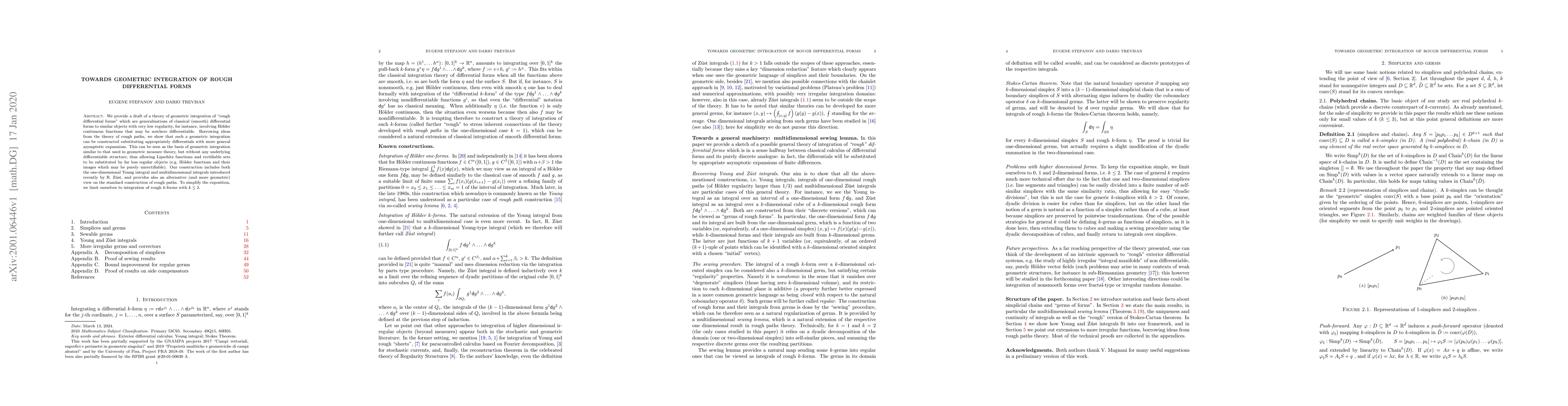 We provide a draft of a theory of geometric integration of rough differential forms which are generalizations of classical (smooth) differential forms to similar objects with very low regularity, for instance, involving H\"older continuous functions that may be nowhere differentiable. Borrowing ideas from the theory of rough paths, we show that such a geometric integration can be constructed substituting appropriately differentials with more general asymptotic expansions. This can be seen as the basis of geometric integration similar to that used in geometric measure theory, but without any underlying differentiable structure, thus allowing Lipschitz functions and rectifiable sets to be substituted by far less regular objects (e.g. H\"older functions and their images which may be purely unrectifiable). Our construction includes both the one-dimensional Young integral and multidimensional integrals introduced recently by R. Z\"ust. To simplify the exposition, we limit ourselves to integration of forms of dimensions not exceeding two.