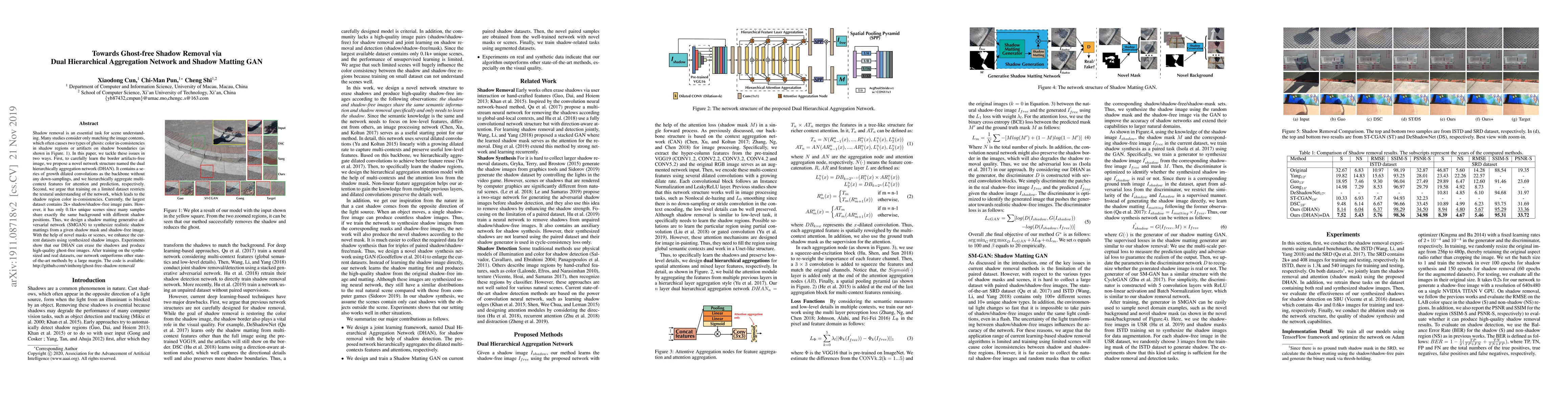 This paper proposes a dual hierarchical aggregation network (DHAN) to remove shadows without producing ghost artifacts, and a shadow matting generative adversarial network (SMGAN) to synthesize additional training data. The DHAN uses growth dilated convolutions and hierarchical feature aggregation, while the SMGAN enhances datasets with realistic shadow images, leading to superior shadow removal performance compared to existing methods.