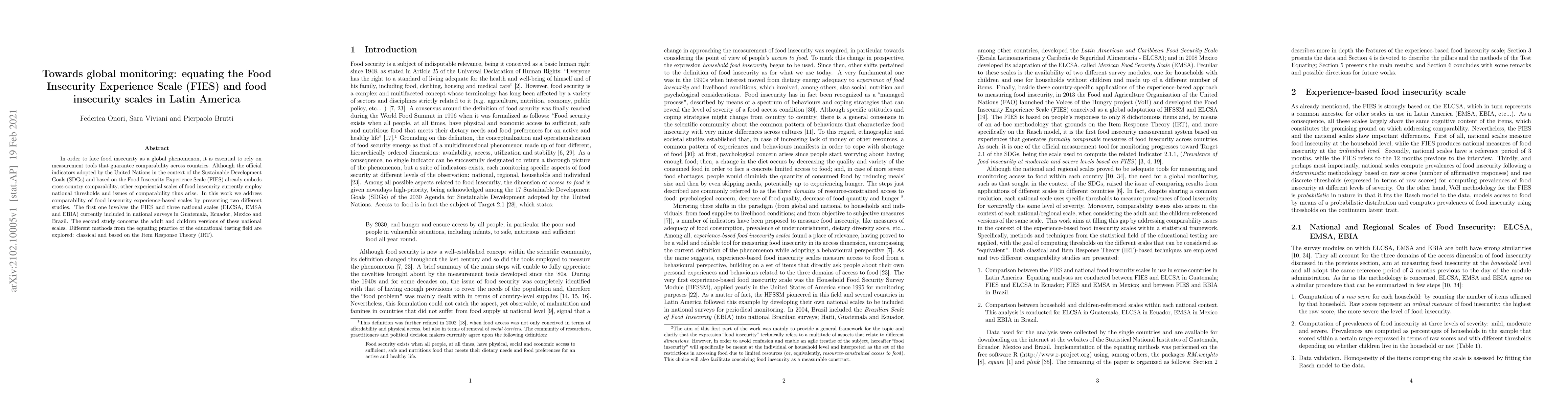 This paper aims to enhance global food insecurity monitoring by equating the Food Insecurity Experience Scale (FIES) with national scales in Latin America. It employs classical and Item Response Theory (IRT) methods to ensure comparability across different food insecurity measurement tools.