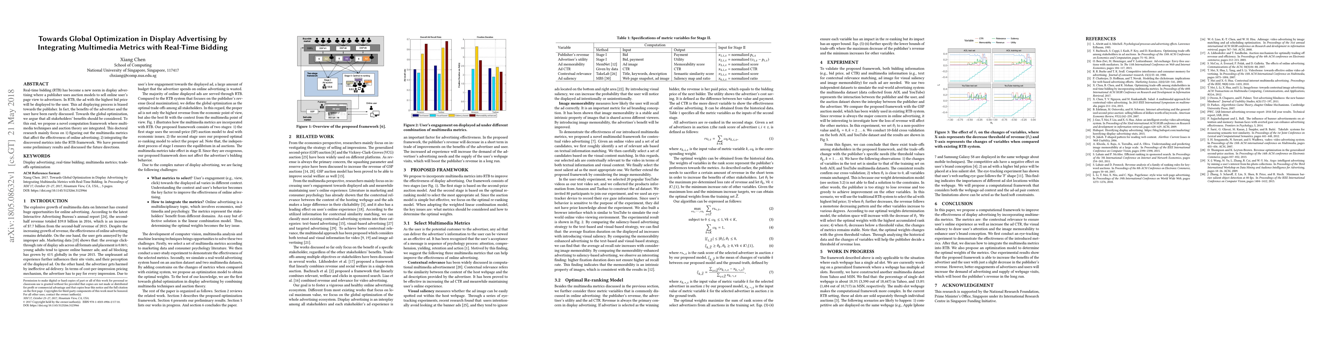 This paper proposes a novel framework integrating multimedia metrics with real-time bidding (RTB) to optimize global benefits in display advertising. The research focuses on identifying multimedia metrics affecting ad effectiveness and incorporating these metrics into the RTB framework to enhance advertiser, publisher, and user interests.