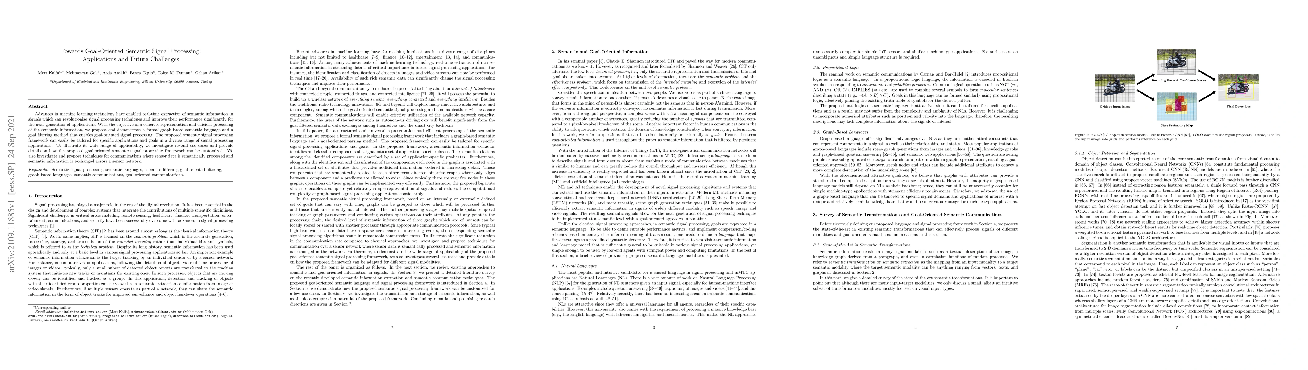 Advances in machine learning technology have enabled real-time extraction of semantic information in signals which can revolutionize signal processing techniques and improve their performance significantly for the next generation of applications. With the objective of a concrete representation and efficient processing of the semantic information, we propose and demonstrate a formal graph-based semantic language and a goal filtering method that enables goal-oriented signal processing. The proposed semantic signal processing framework can easily be tailored for specific applications and goals in a diverse range of signal processing applications. To illustrate its wide range of applicability, we investigate several use cases and provide details on how the proposed goal-oriented semantic signal processing framework can be customized. We also investigate and propose techniques for communications where sensor data is semantically processed and semantic information is exchanged across a sensor network.