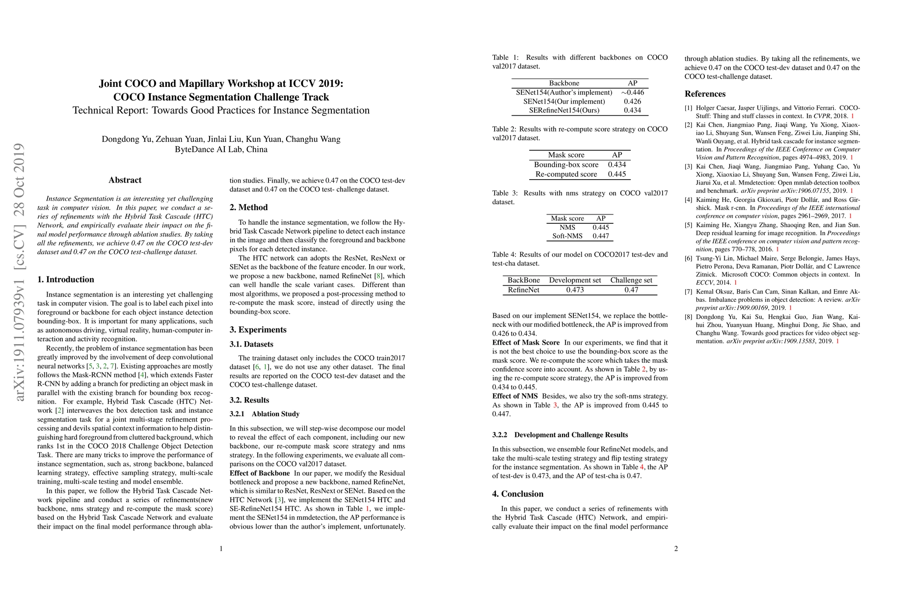 This paper refines the Hybrid Task Cascade (HTC) Network for instance segmentation, achieving notable performance improvements on COCO datasets, demonstrating the effectiveness of the proposed methods through ablation studies.