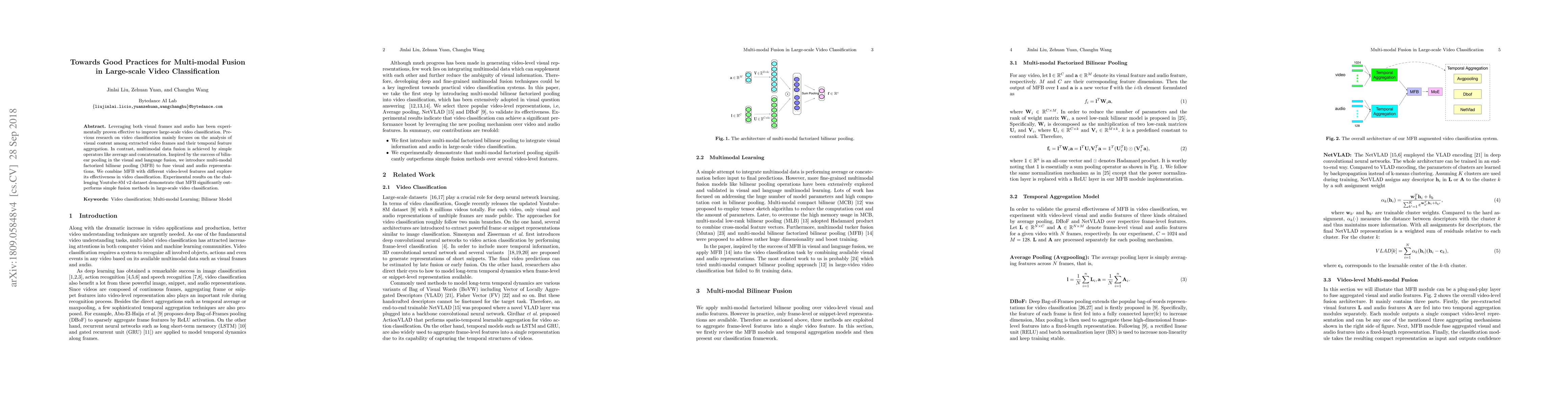 This paper proposes multi-modal factorized bilinear pooling (MFB) for fusing visual and audio representations to enhance large-scale video classification. Experimental results on the Youtube-8M v2 dataset show that MFB significantly outperforms simple fusion methods.