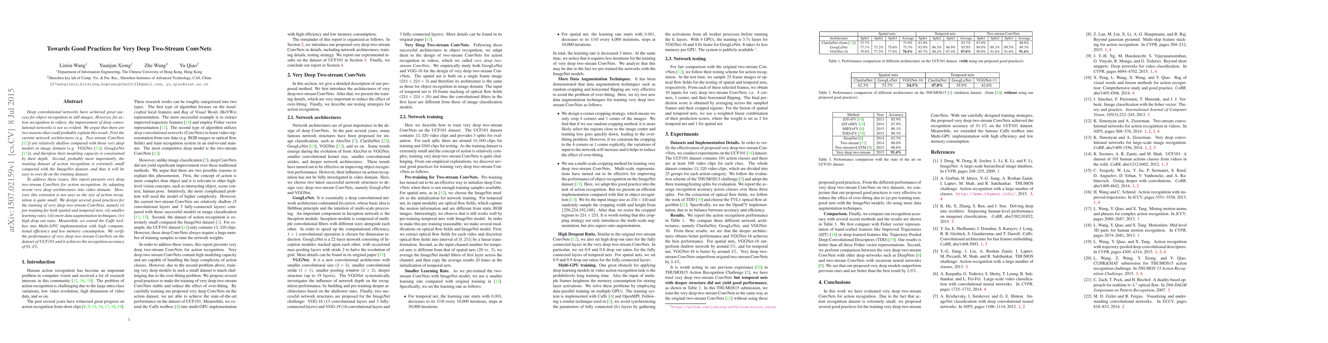 This paper proposes very deep two-stream convolutional networks for action recognition, addressing the limitations of shallow architectures and small training datasets. It introduces good practices including pre-training, smaller learning rates, data augmentation, and high dropout ratios, achieving 91.4% accuracy on UCF101.