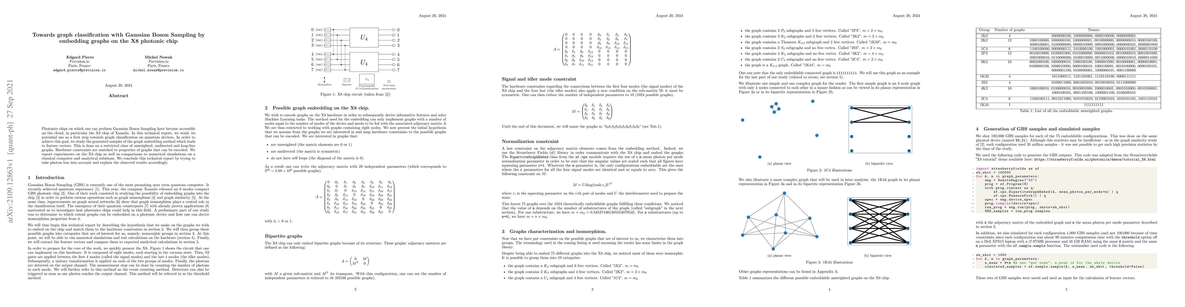 Photonics chips on which one can perform Gaussian Boson Sampling have become accessible on the cloud, in particular the X8 chip of Xanadu. In this technical report, we study its potential use as a first step towards graph classification on quantum devices. In order to achieve this goal, we study the generated samples of the graph embedding method which leads to feature vectors. This is done on a restricted class of unweighted, undirected and loop-free graphs. Hardware constraints are matched to properties of graphs that can be encoded. We report experiments on the X8 chip as well as comparisons to numerical simulations on a classical computer and analytical solutions. We conclude this technical report by trying to take photon loss into account and explain the observed results accordingly.