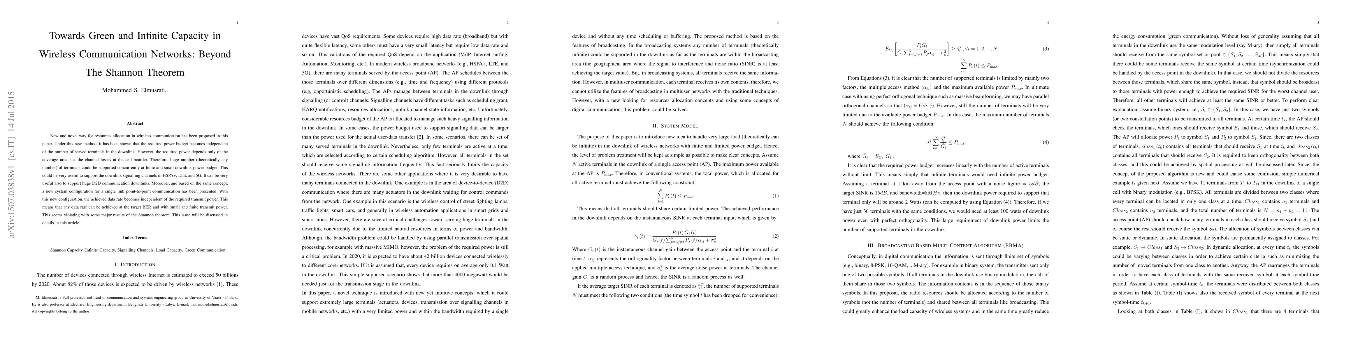 This paper proposes a novel resource allocation method in wireless communication that allows supporting an infinite number of terminals with a finite power budget, challenging the limitations of the Shannon theorem. The method achieves this by decoupling the power requirement from the number of terminals, relying instead on coverage area, and presents a new point-to-point communication system where data rate is independent of transmit power.