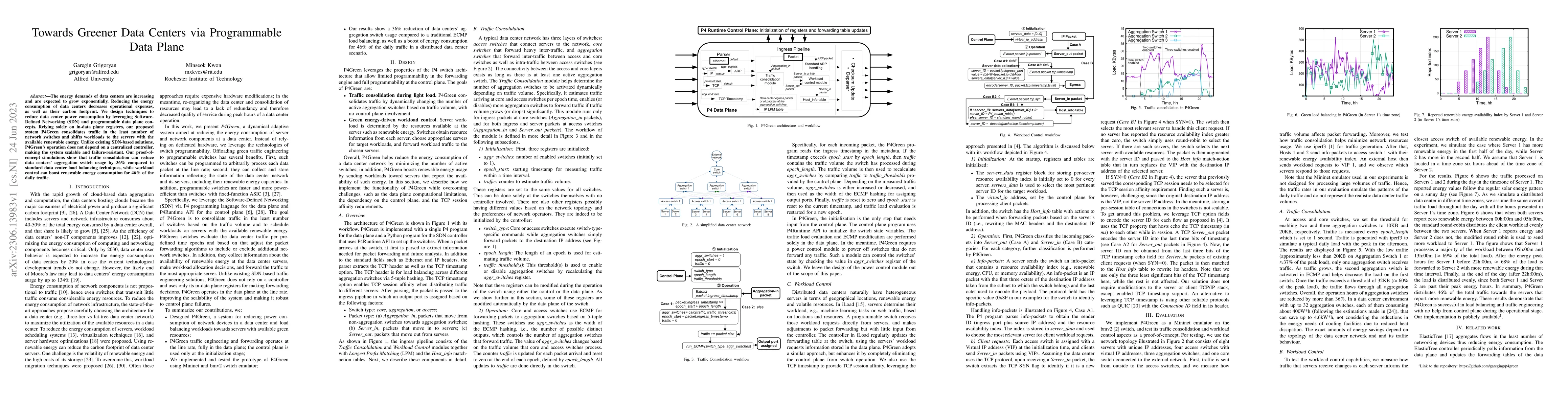 This paper proposes P4Green, a system leveraging SDN and programmable data planes to reduce data center power consumption by consolidating traffic and shifting workloads to renewable energy-powered servers, achieving a 36% reduction in switch usage and a 46% increase in renewable energy use. Unlike centralized solutions, P4Green's decentralized operation enhances scalability and fault tolerance.