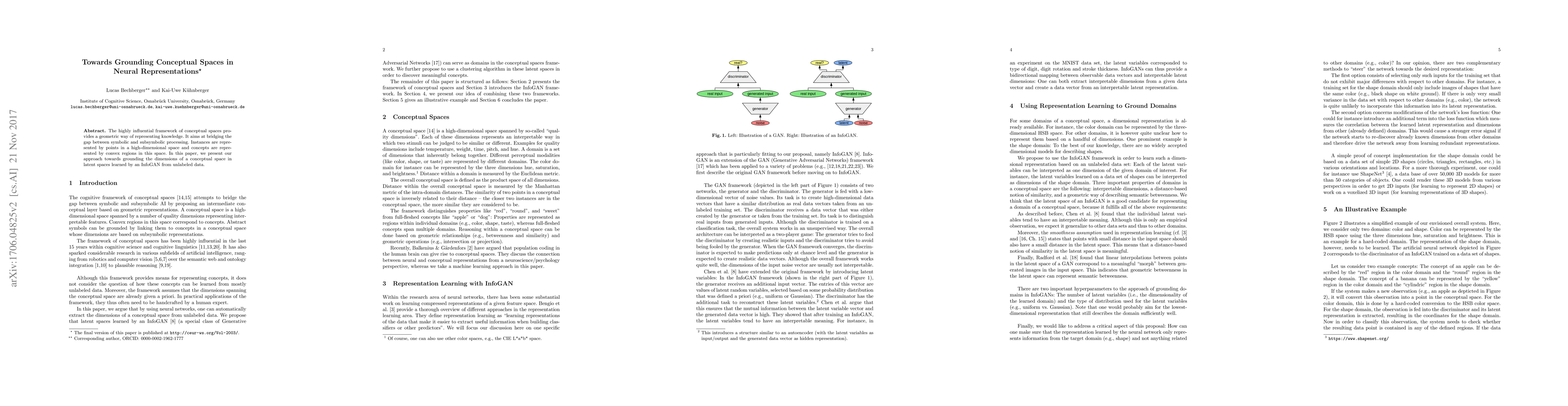 This paper explores grounding the dimensions of conceptual spaces—a framework representing knowledge geometrically—in neural representations learned by an InfoGAN from unlabeled data. The goal is to bridge symbolic and subsymbolic processing by aligning high-dimensional neural latent spaces with conceptual regions.