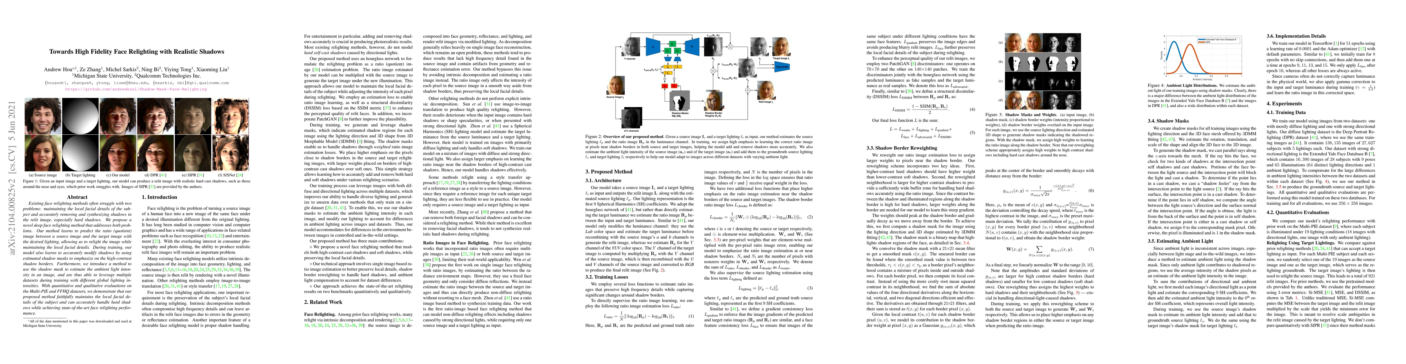This paper proposes a novel deep learning method for high fidelity face relighting that maintains local facial details and accurately handles hard shadows. The method predicts a ratio image to relight while preserving details, and uses shadow masks to modify shadows and estimate ambient light intensity, achieving state-of-the-art performance on Multi-PIE and FFHQ datasets.