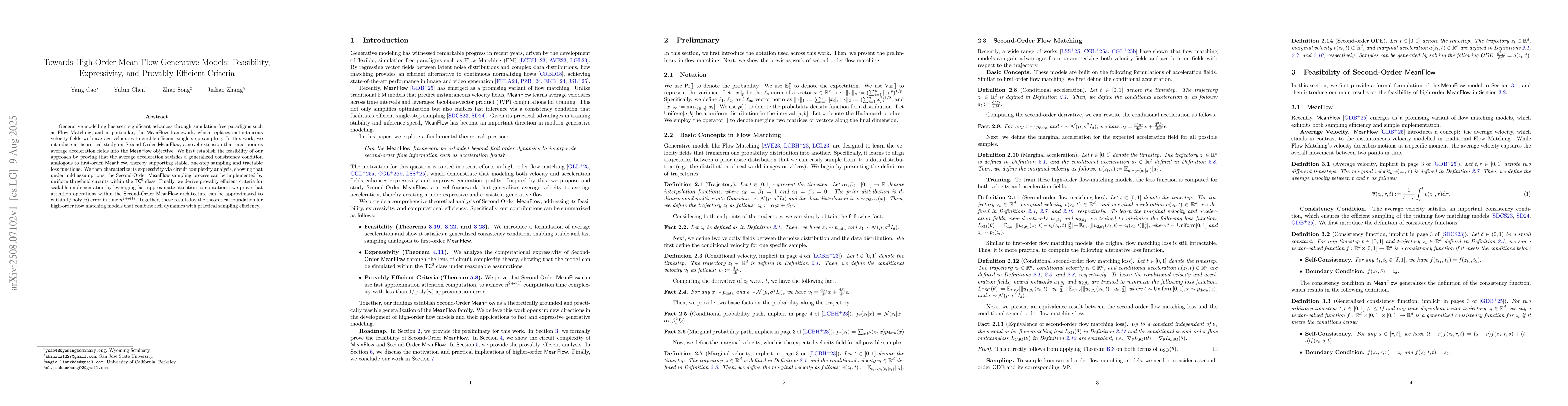 Generative modelling has seen significant advances through simulation-free paradigms such as Flow Matching, and in particular, the MeanFlow framework, which replaces instantaneous velocity fields with average velocities to enable efficient single-step sampling. In this work, we introduce a theoretical study on Second-Order MeanFlow, a novel extension that incorporates average acceleration fields into the MeanFlow objective. We first establish the feasibility of our approach by proving that the average acceleration satisfies a generalized consistency condition analogous to first-order MeanFlow, thereby supporting stable, one-step sampling and tractable loss functions. We then characterize its expressivity via circuit complexity analysis, showing that under mild assumptions, the Second-Order MeanFlow sampling process can be implemented by uniform threshold circuits within the $\mathsf{TC}^0$ class. Finally, we derive provably efficient criteria for scalable implementation by leveraging fast approximate attention computations: we prove that attention operations within the Second-Order MeanFlow architecture can be approximated to within $1/\mathrm{poly}(n)$ error in time $n^{2+o(1)}$. Together, these results lay the theoretical foundation for high-order flow matching models that combine rich dynamics with practical sampling efficiency.
