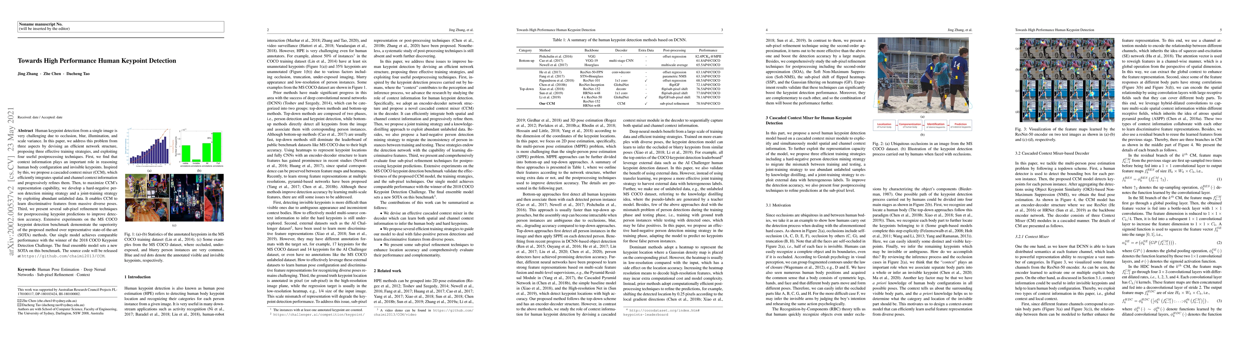 This paper proposes a high-performance human keypoint detection method addressing challenges like occlusion and scale variance through an efficient network structure, effective training strategies, and postprocessing techniques. The cascaded context mixer (CCM) integrates context information, while hard-negative mining and joint training enhance feature learning. Postprocessing techniques further refine keypoint predictions, achieving state-of-the-art results on the MS COCO benchmark.
