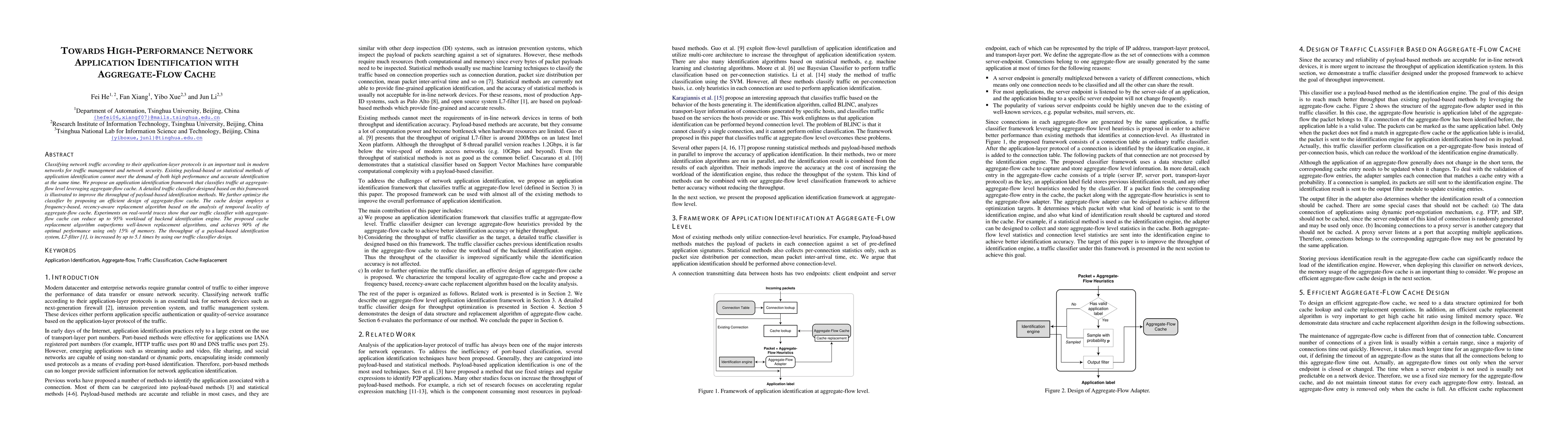 A new traffic classification framework uses an aggregate-flow cache to improve performance and accuracy in network application identification. The proposed design reduces the workload of backend identification engines by up to 95%.