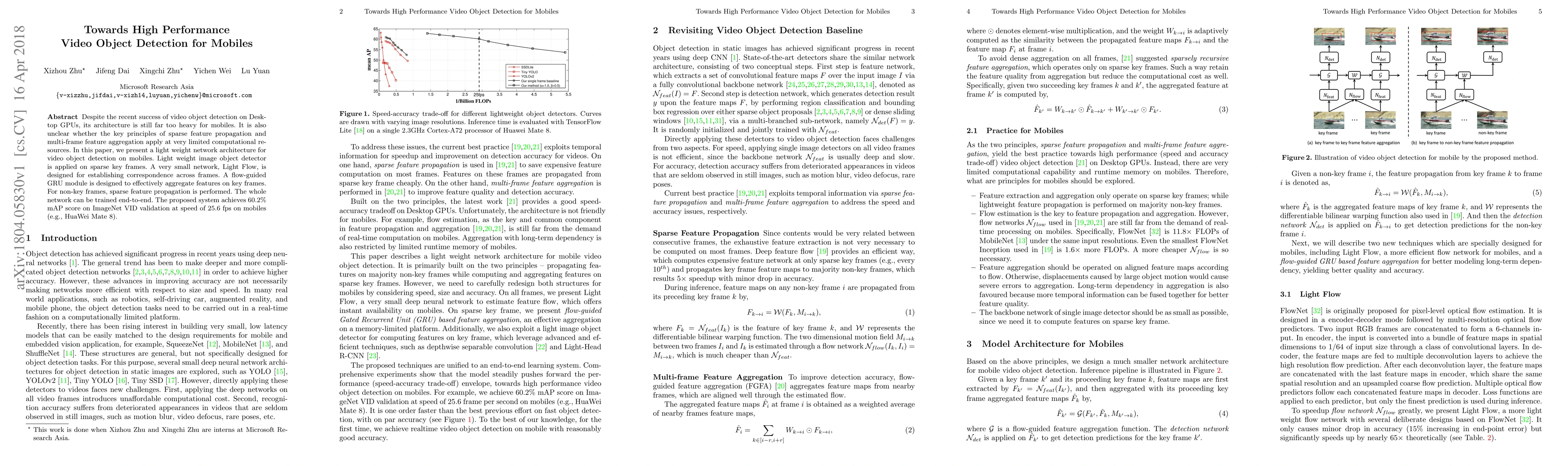 This paper introduces a lightweight network architecture for efficient video object detection on mobile devices, utilizing sparse key frames and a small network for inter-frame correspondence, achieving 60.2% mAP at 25.6 fps on mobile platforms like the HuaWei Mate 8.