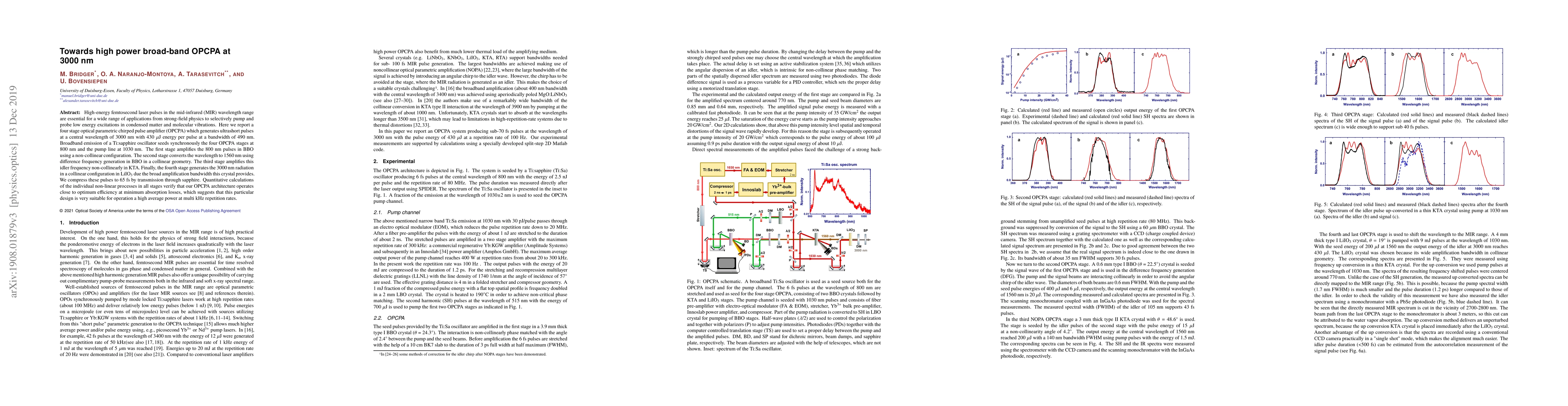 High-energy femtosecond laser pulses in the mid-infrared (MIR) wavelength range are essential for a wide range of applications from strong-field physics to selectively pump and probe low energy excitations in condensed matter and molecular vibrations. Here we report a four stage optical parametric chirped pulse amplifier (OPCPA) which generates ultrashort pulses at a central wavelength of 3000 nm with 430 $\mu$J energy per pulse at a bandwidth of 490 nm. Broadband emission of a Ti:sapphire oscillator seeds synchronously the four OPCPA stages at 800 nm and the pump line at 1030 nm. The first stage amplifies the 800 nm pulses in BBO using a non-collinear configuration. The second stage converts the wavelength to 1560 nm using difference frequency generation in BBO in a collinear geometry. The third stage amplifies this idler frequency non-collinearly in KTA. Finally, the fourth stage generates the 3000 nm radiation in a collinear configuration in LiIO$_3$ due the broad amplification bandwidth this crystal provides. We compress these pulses to 65 fs by transmission through sapphire. Quantitative calculations of the individual non-linear processes in all stages verify that our OPCPA architecture operates close to optimum efficiency at minimum absorption losses, which suggests that this particular design is very suitable for operation a high average power at multi kHz repetition rates.